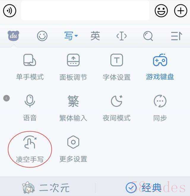 最后,我还发现,百度手写输入法的功能选项中有个叫“凌空手写”的功能,这个功能是利用了手机前置摄像头,从而实现可以在凌空手写的输入体验。是一个非常有创意的输入形式,通过点击左上角的键盘熊头菜单(du头)中找到凌空手写,点击开启即可。