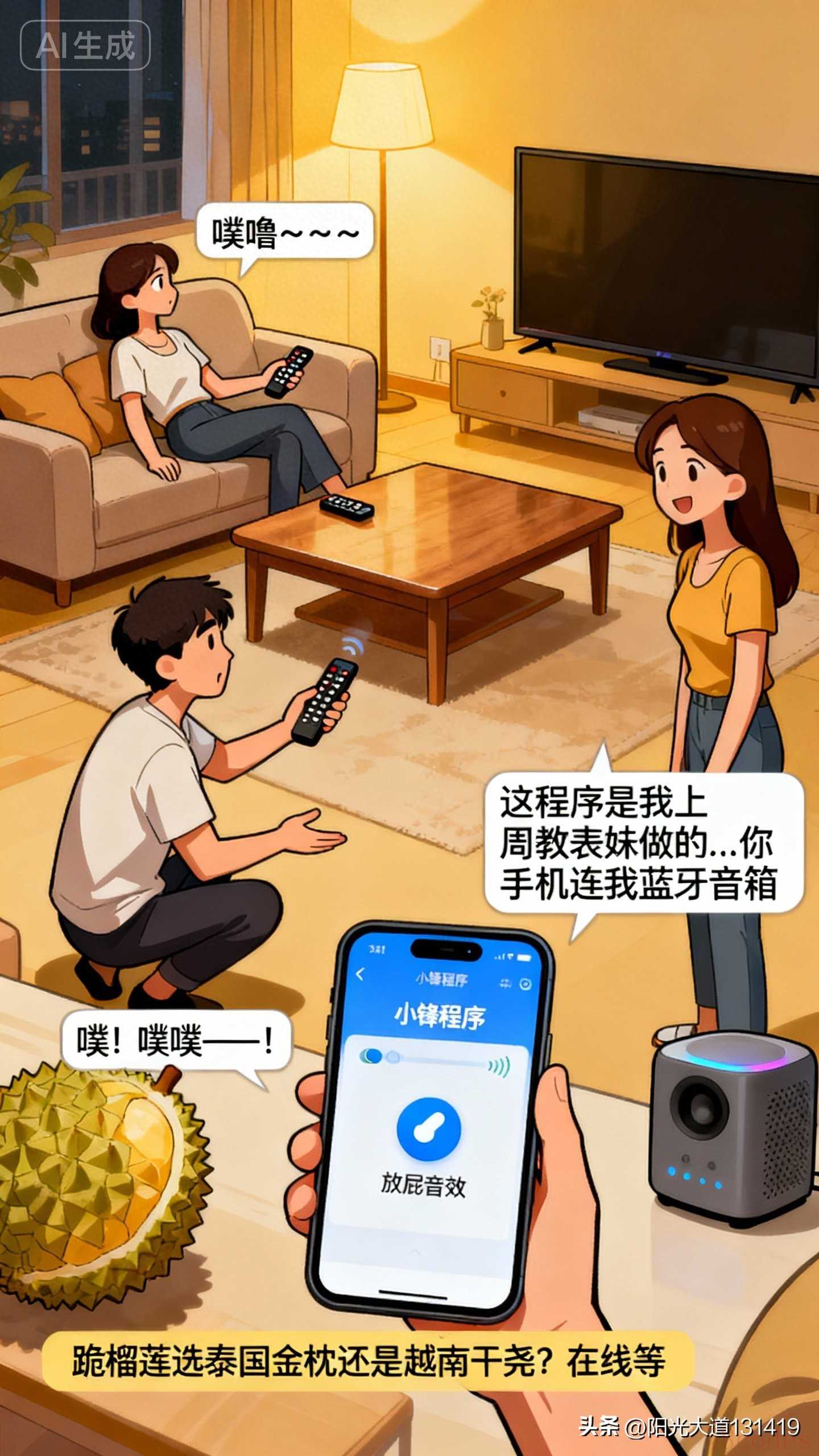 哈哈哈,跟你说个我朋友的糗事。他最近学了个编程,叫小锋程序,能模拟各种声音。那天他媳妇正靠在沙发上看电视,他偷偷摸出手机,蹲在茶几旁边,点了一下“放屁音效”——“噗噜~~~”特别逼真,还带拐弯的。他媳妇愣了一下,转头盯着他。他赶紧装傻,一脸无辜地说:“沙发……沙发响了吧?”他媳妇没说话,默默拿起遥控器,把电视静音了。然后,整个客厅安静得只剩下两人的呼吸声。过了三秒,他忍不住,又手贱按了一下:“噗!噗噗——!”这回他媳妇慢慢站起来,微笑着对他说:“你知道吗?这程序是我上周教表妹编程时做的……你手机现在连着我蓝牙音箱。”然后……然后他今晚在群里问我们:“跪榴莲的话,是选泰国金枕还是越南干尧?在线等,挺急的。”真是程序坑我,我坑自己啊!