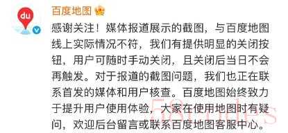 对于用户反映的情况,百度回复红星资本局称,截图与百度地图线上实际情况不符,“我们有提供明显的关闭按钮,用户可随时手动关闭,且关闭后当日不会再触发。”百度方面表示,正在联系首发的媒体和用户核查。