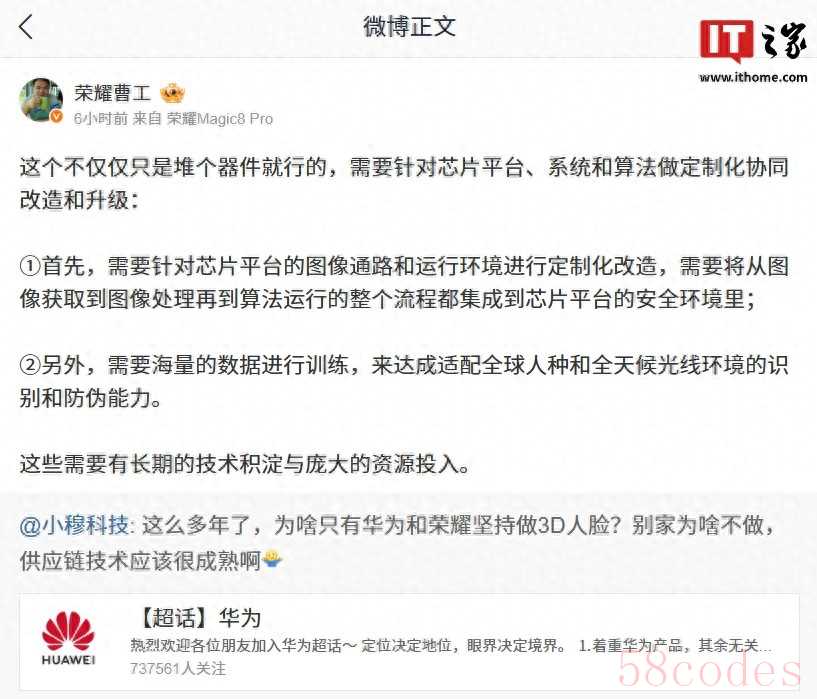IT之家 11 月 26 日消息,博主 @小穆科技 询问:“这么多年了,为啥只有华为和荣耀坚持做 3D 人脸?别家为啥不做,供应链技术应该很成熟啊。”荣耀研发工程师 @荣耀曹工 今日发文解答了这一问题。