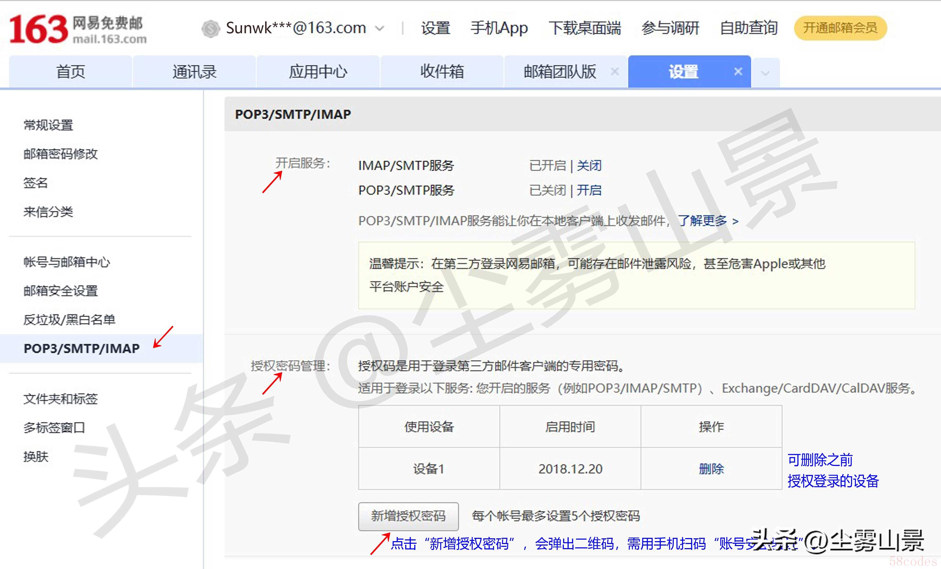 6、在图6,找到“POP3/SMTP/IMAP”的“授权密码管理:”(授权码是用于登录第三方邮箱的专用密码),每个账号最多设置5个授权密码。点击“新增授权密码”可为手机登录该电子邮箱生成专用密码,手机添加电子邮箱时需要输入该专用密码,您如果有两台手机需要登录该电子邮箱,则需要分别生成两个不同的专用密码,见图6,见图11,见图16。点击“新增授权密码”,会弹出二维码,需用注册电子邮箱的手机,按提示扫描二维码、进行“账号安全验证”。在“授权密码管理:”手机成功添加电子邮箱后(如:设备1,启用时间2018.12.20),如需要解除手机的登录权限,在这里点击“删除”即可。也可以在:IMAP /SMTP服务 选择“关闭”POP3/SMTP服务 选择“关闭”即可关闭手机登录邮箱服务。