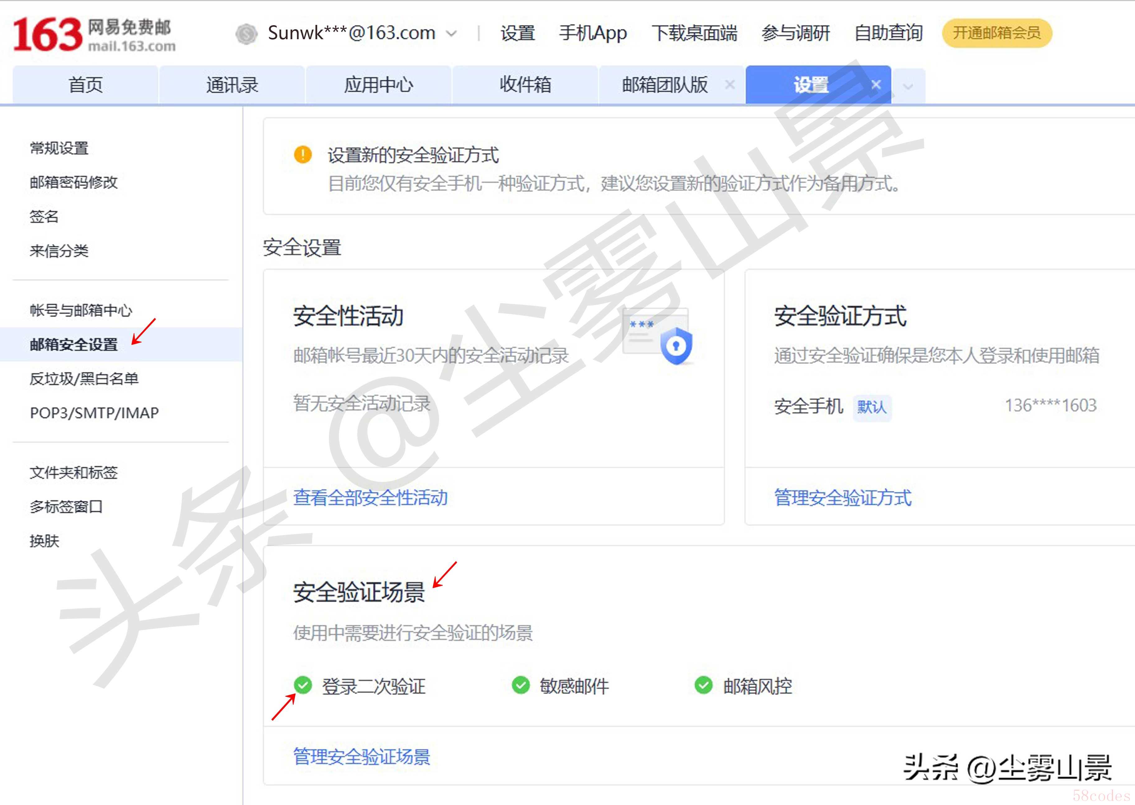 4、点击图4邮箱页面左侧的“邮箱安全设置”,找到“安全验证场景”,勾选“登录二次验证”,这样在电脑登录电子邮箱时,需要登录密码、同时需要手机的短信验证码才能登录,增加了电子邮箱的安全性,见图5。