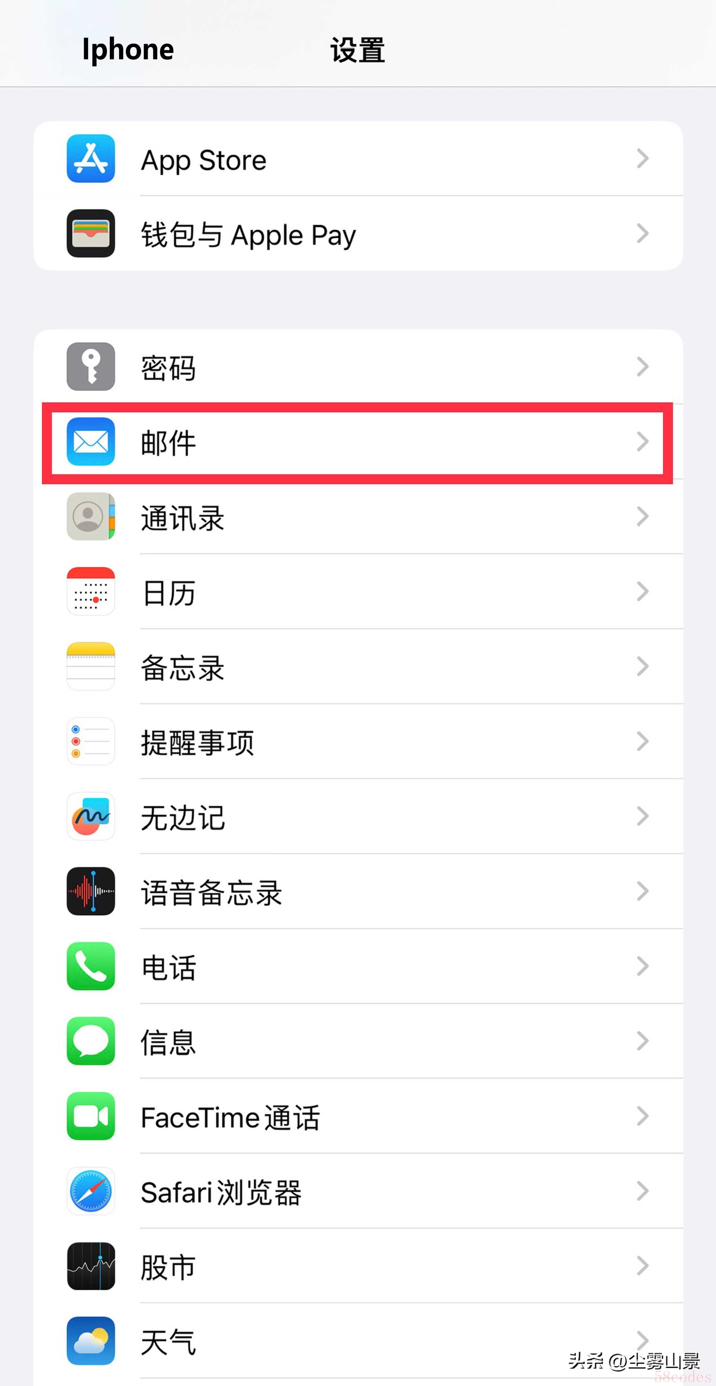 1、手机A⑴打开手机“设置”,点击“邮件”,见图7。