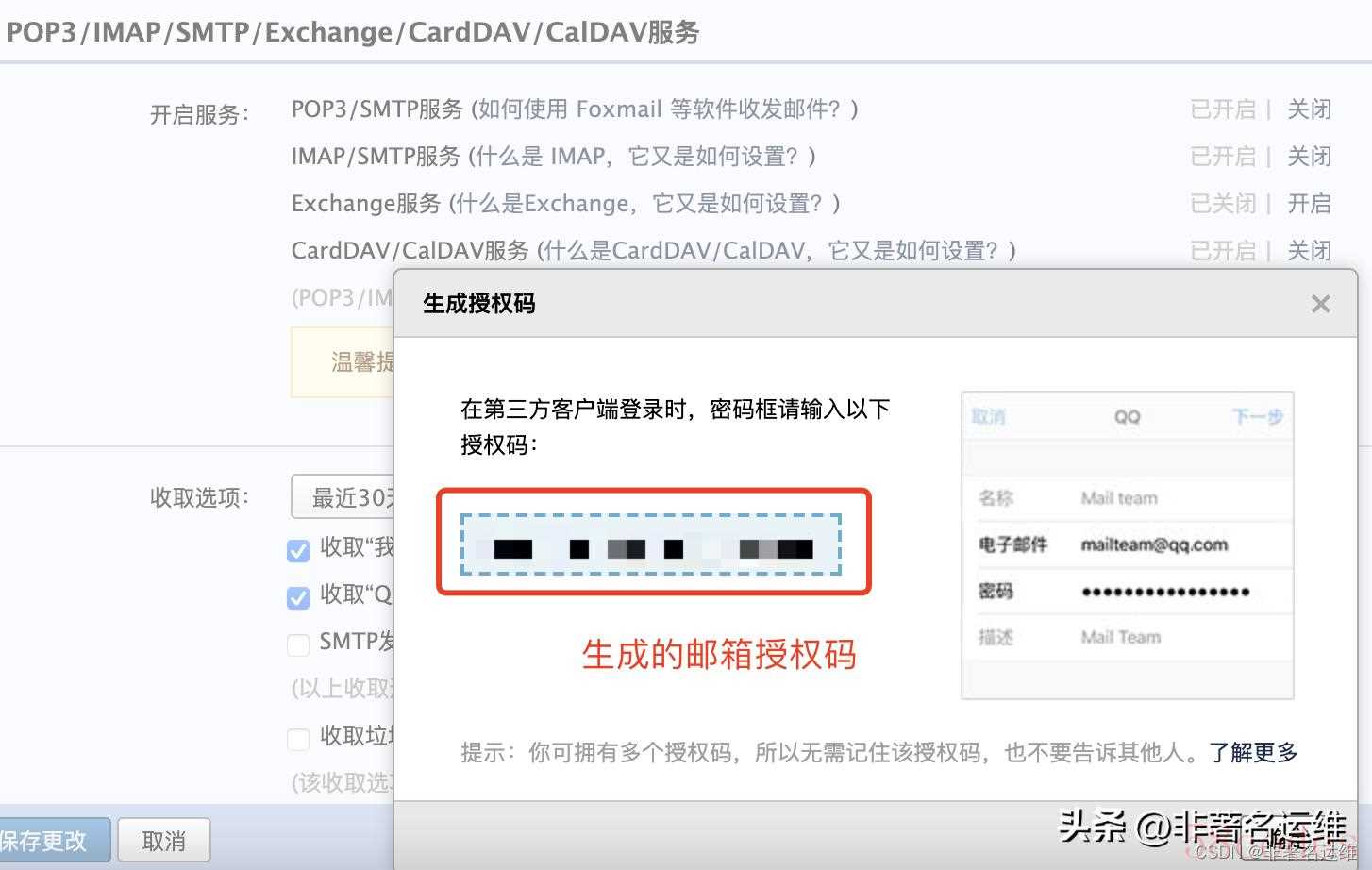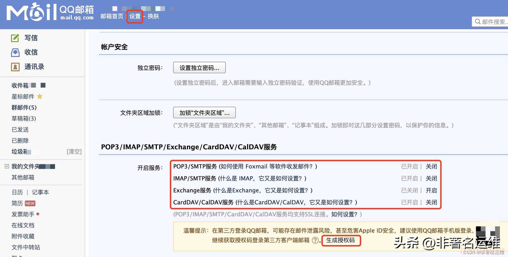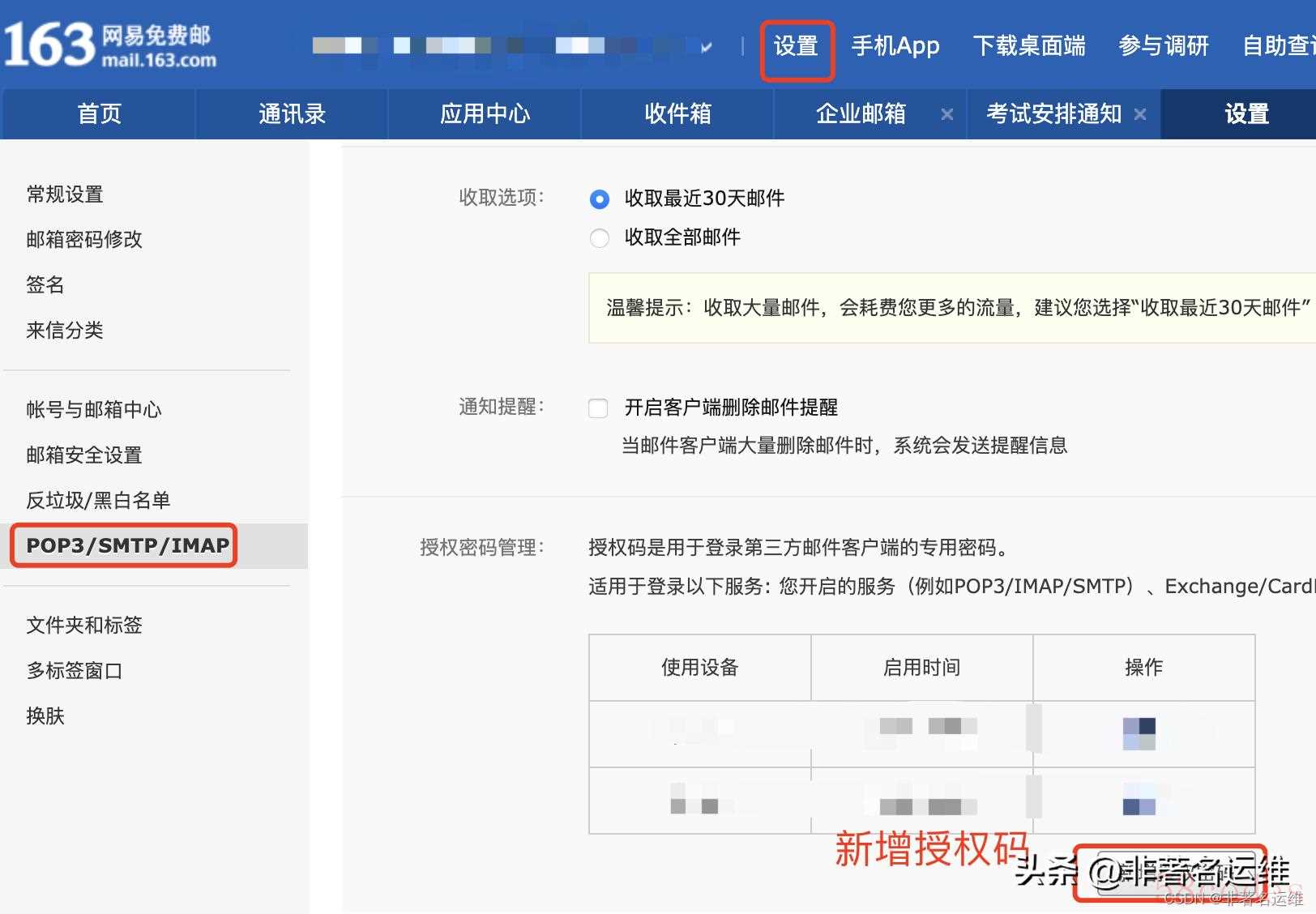 第二步:在网页版邮箱设置中生成授权码,用于在第三方邮箱APP中登陆邮箱。