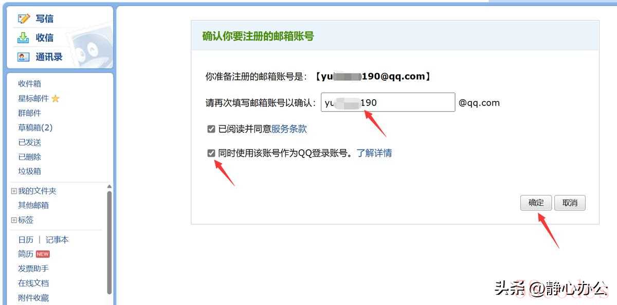 在打开的界面再次填写邮箱账号进行确认,如果想使用该邮箱账号登录QQ,记得勾选【同时使用该账号作为QQ登录账号】,单击【确定】。这样,英文邮箱账号就注册好了。