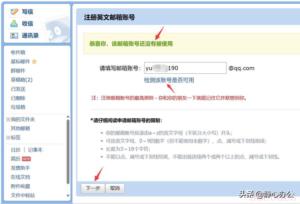 阅读申请邮箱账号的限制条件,在邮箱账号编辑框中输入想要设置的英文邮箱账号,并检测该账号是否可用。经检测可用后,可点击【下一步】按钮。