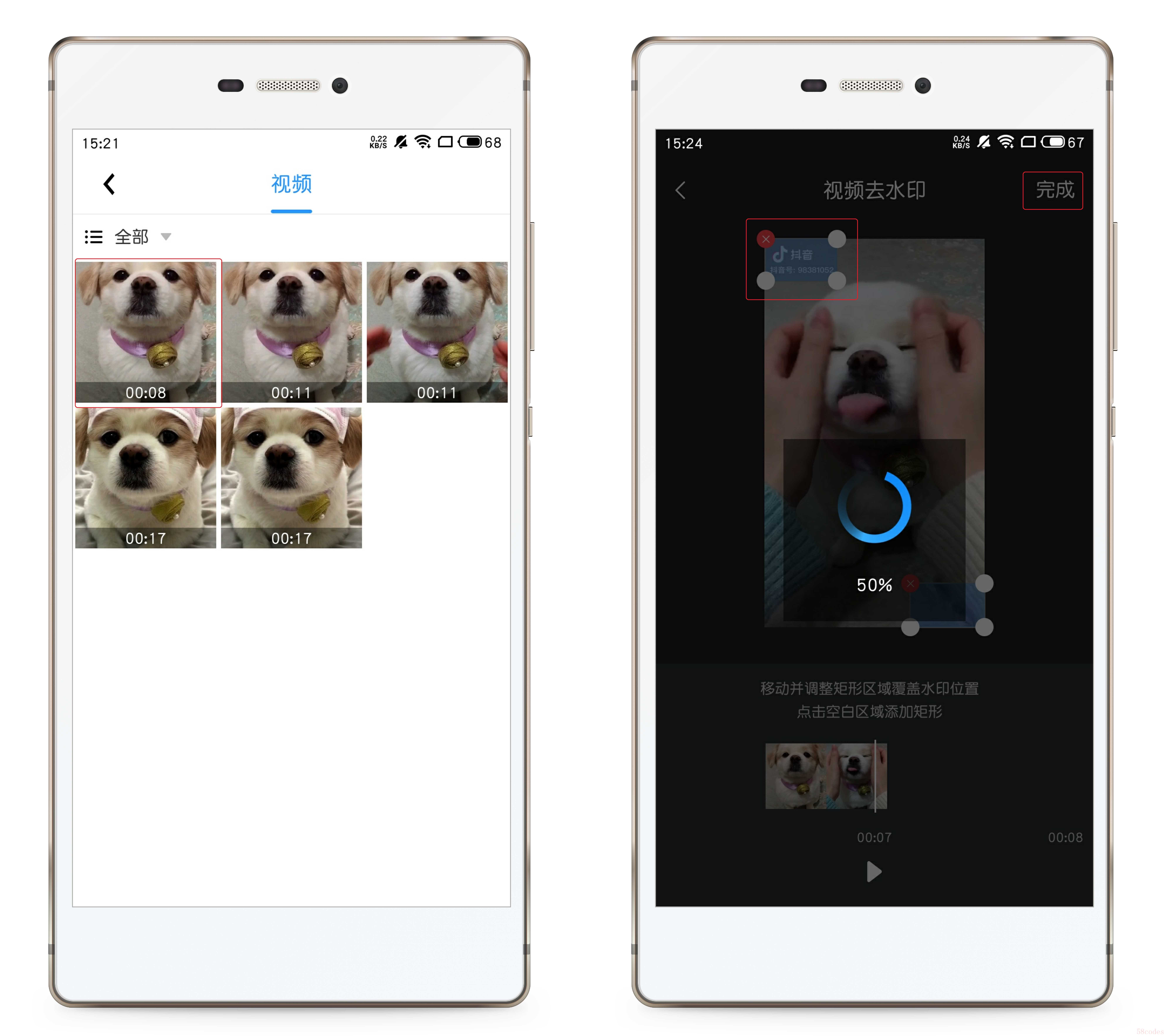 我们点击进入【去视频水印】功能,将会打开手机视频库,选取一个你想要去除水印的视频点击屏幕建立矩形选区,将蓝色区域覆盖水印位置,最后点击【完成】。
