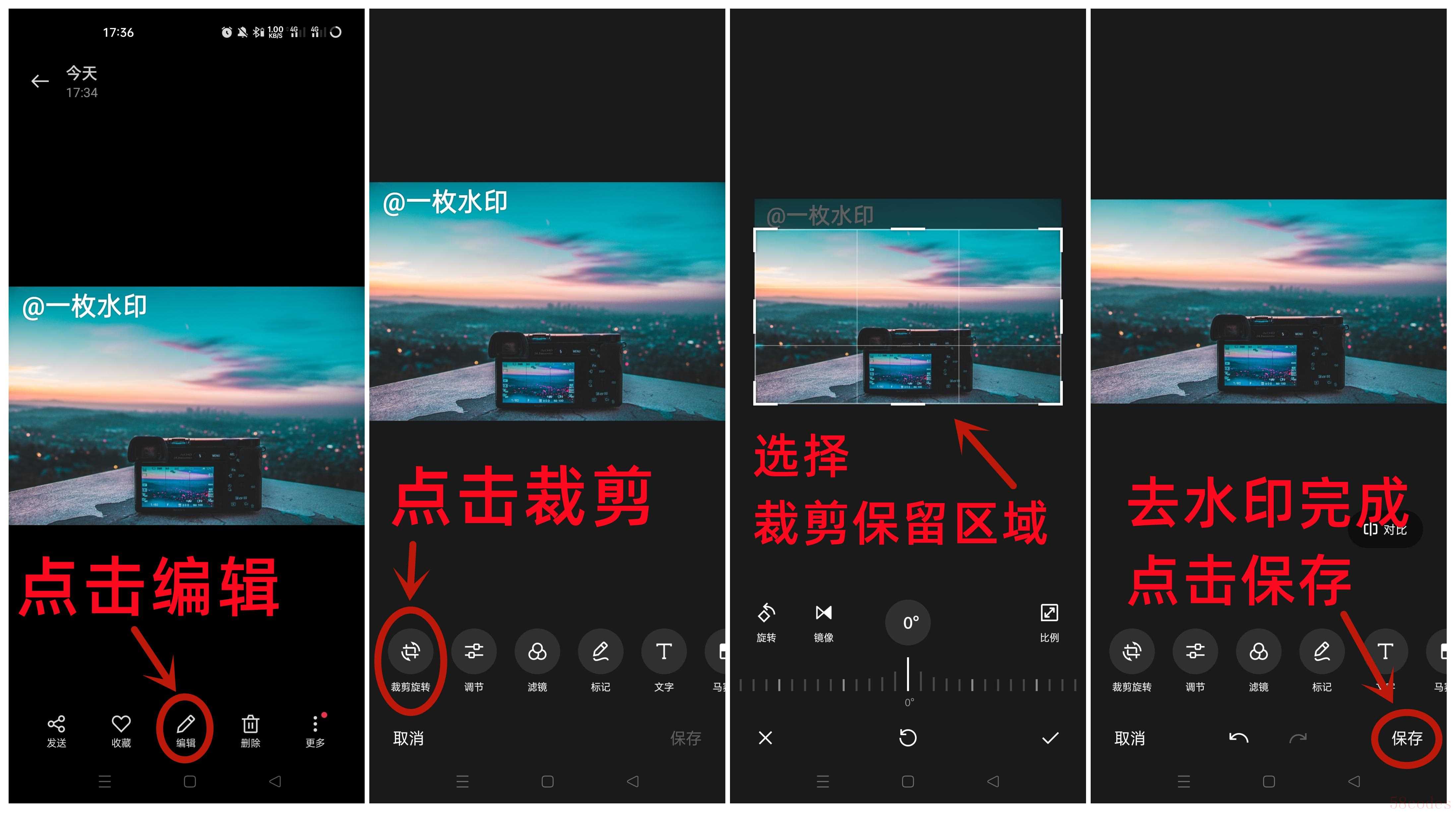 如果只是边角的水印,可以将图片进行裁剪,之后保留无水印部分就可以达到去水印效果啦,操作如图所示。