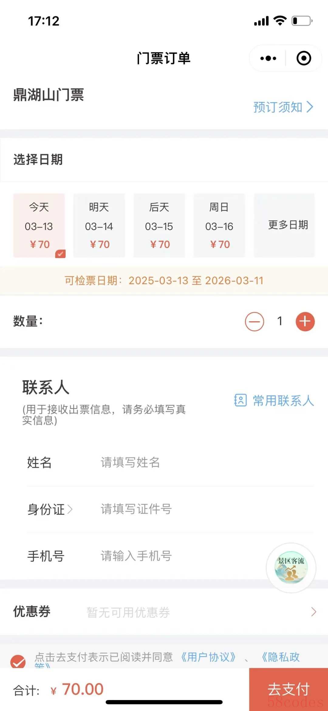 点击“景区票务”---“散客门票预订”进入线上购票。