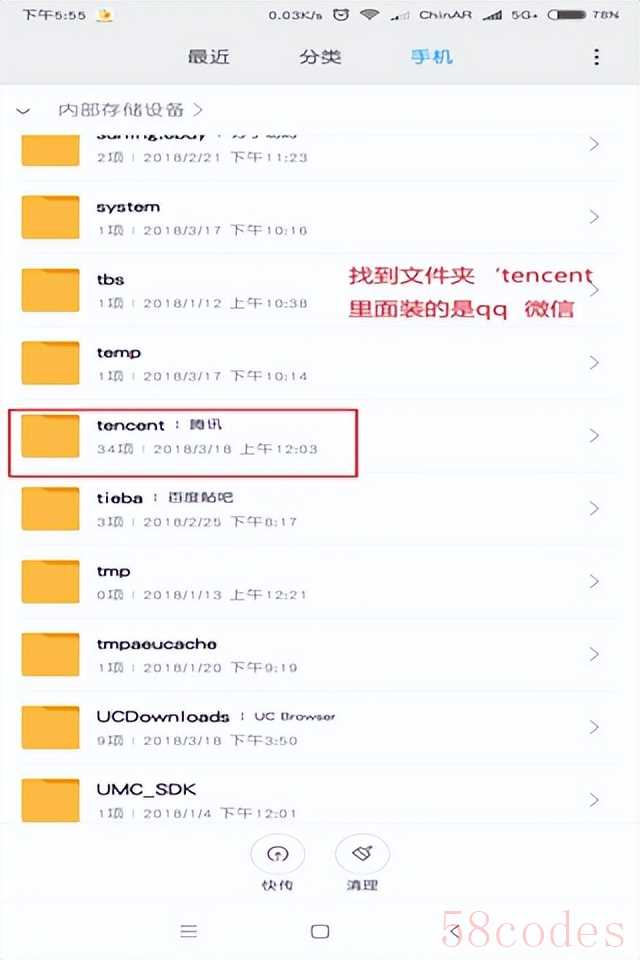 3、进入后我们寻找到一个名为“tencent”的文件夹,有关微信的文件都会放在这里;