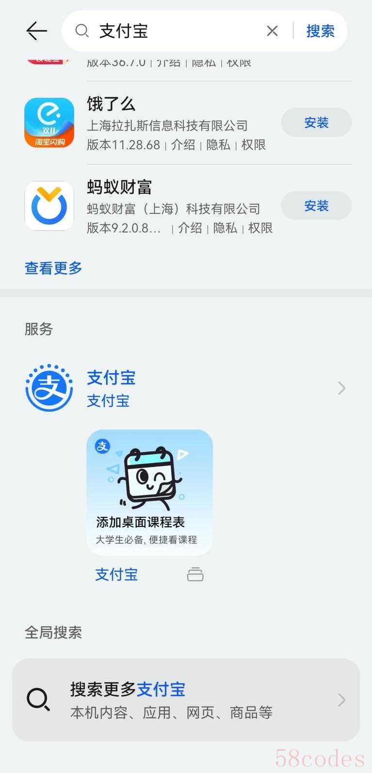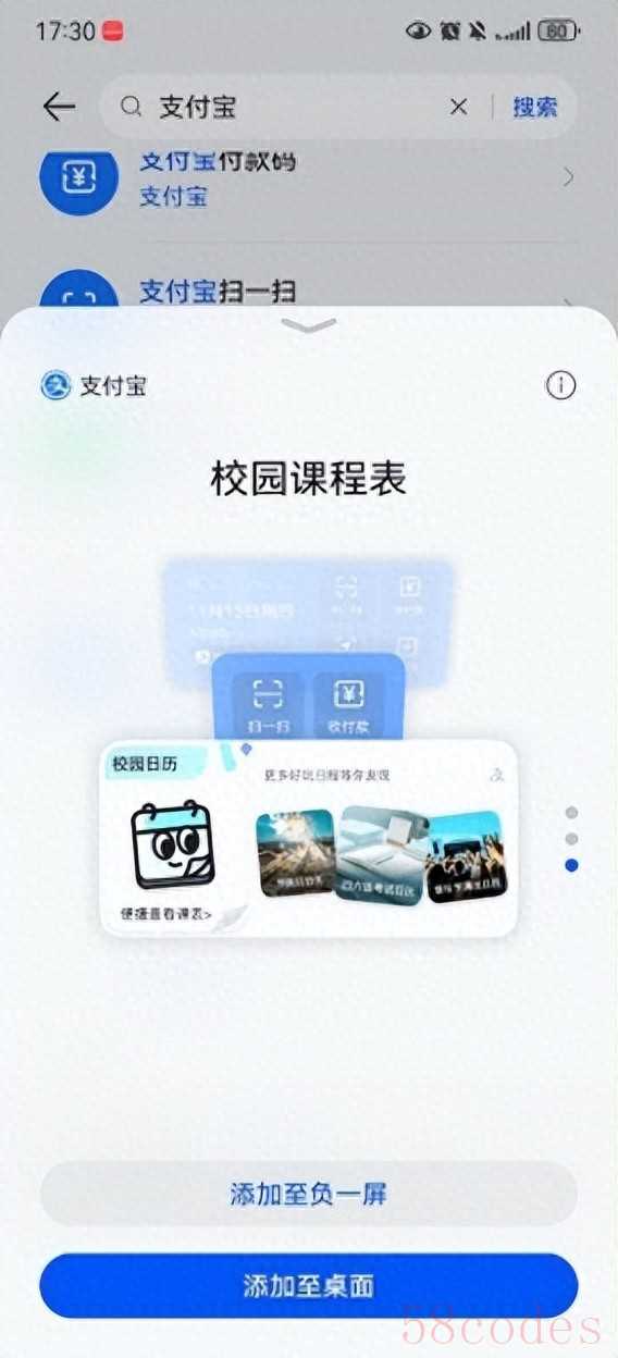 路径一(最快捷):手机桌面右滑进入负一屏,点击顶部的搜索框,输入“支付宝”、“学生课表”或“学生课表添加”等关键词,就会出现课程表卡片,点击一下立即添加。