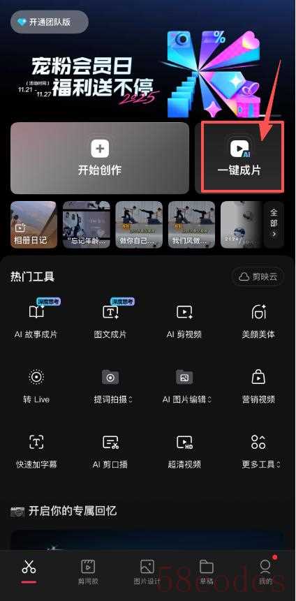 • 点开手机里的剪映 APP,进入首页后,不用找复杂按钮,首页中间 / 上方有个大大的 “一键成片” 按钮(字又大又显眼),直接用手指点一下。
