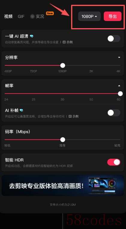• 所有调整都满意后,点右上角的 “导出” 按钮(红色 / 橙色,很显眼);