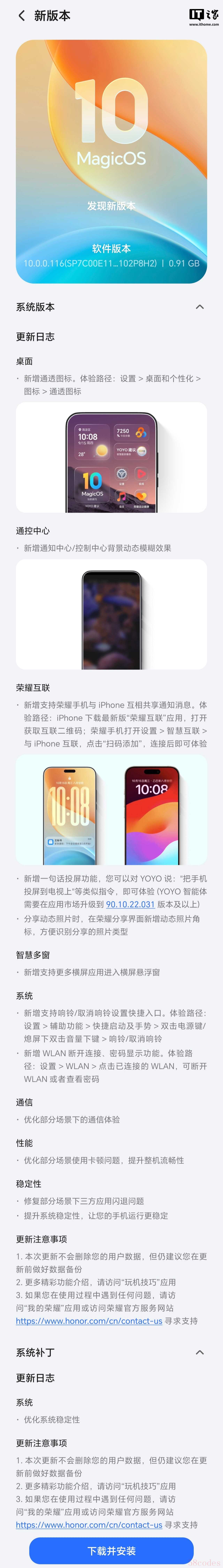 - 新增支持荣耀手机与 iPhone 互相共享通知消息。体验路径:iPhone 下载最新版“荣耀互联”应用,打开获取互联二维码;荣耀手机打开设置 > 智慧互联 > 与 iPhone 互联,点击“扫码添加”,连接后即可体验