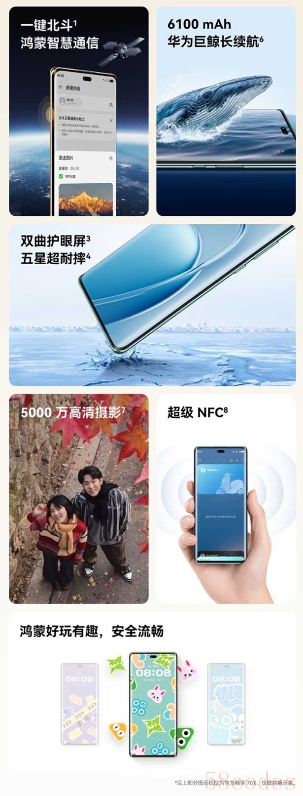 除一键北斗鸿蒙智慧通信外,该机还支持超级 NFC 、屏下指纹,支持蓝牙 5.1、Wi-Fi 5,尺寸为 164mm× 74.88mm× 7.98mm,重约 189 克。