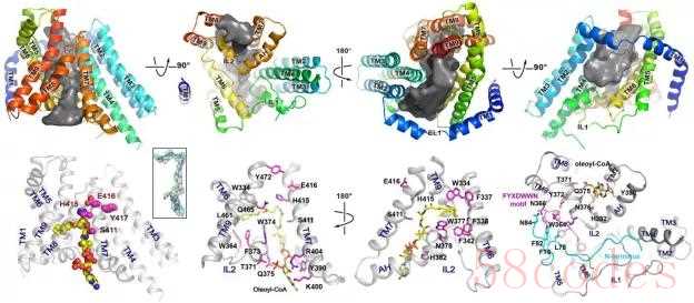 CoA部分结合于开口处IL2以及TM8上的极性残基,CoA向内延伸至活性位点附近,acyl-CoA的脂肪链则结合于反应室内高度疏水的口袋中。