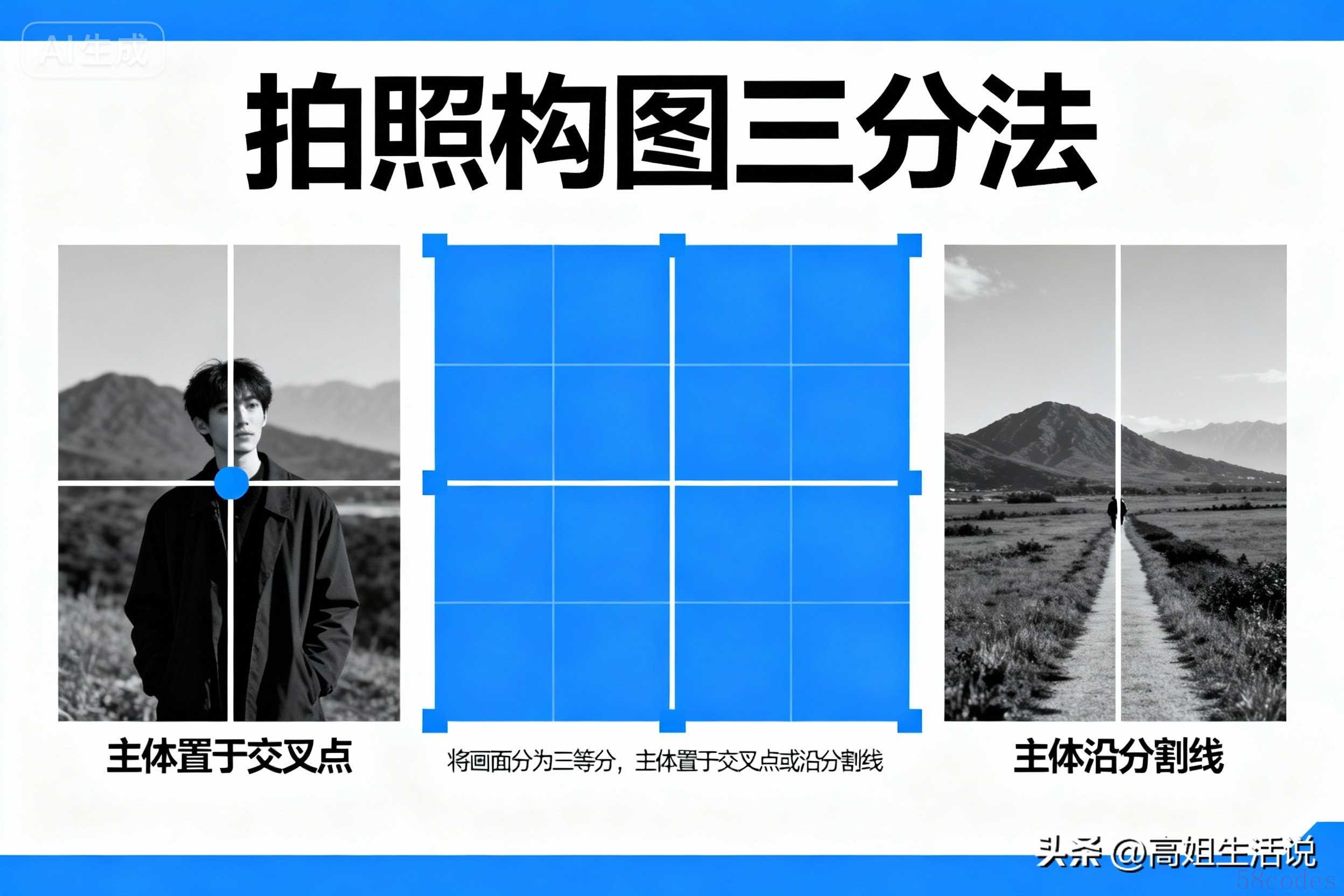 想象你的画面被两条横线、两条竖线分成九宫格,把重要的元素放在这些线的交点上。