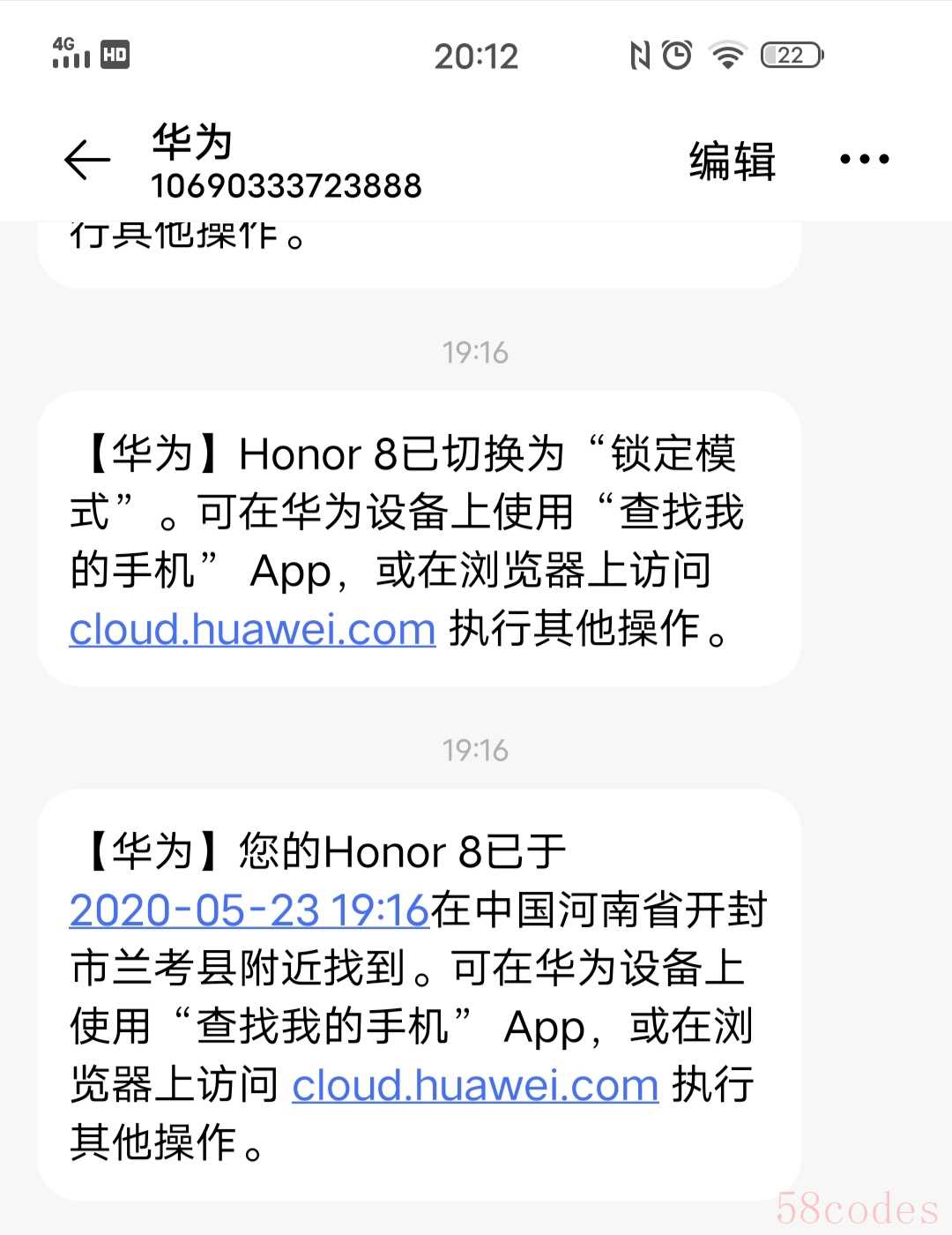 这就是找回手机的全部过程,有偶然成分,但也是必然结果,偶然的是那家正好有人在,我爸恰巧主动询问了,必然的是手机只要开机,即使刷机后,我还是能得到短信定位通知,因为我爸拿到手机开机后,华为又给我手机发了短信。