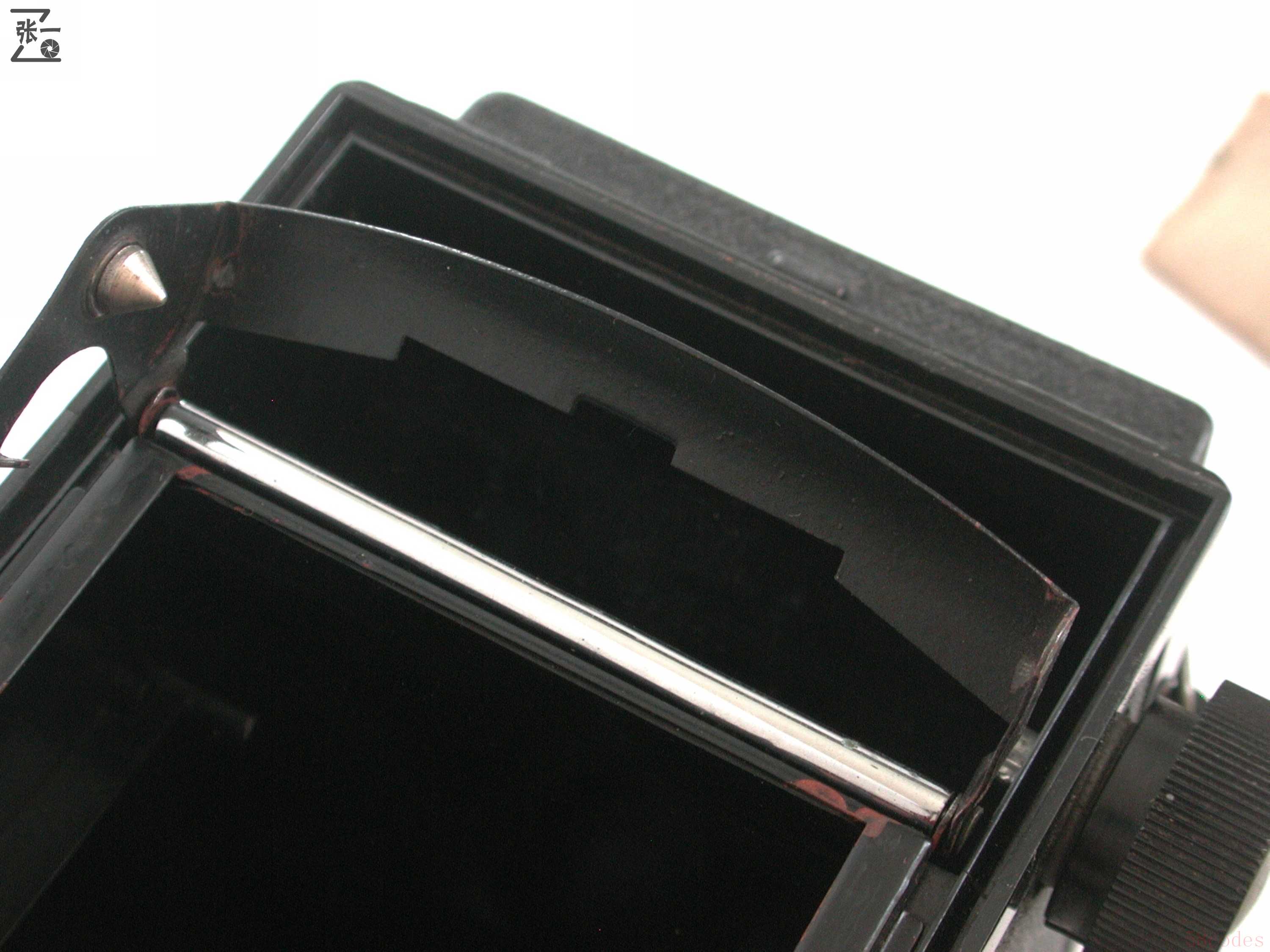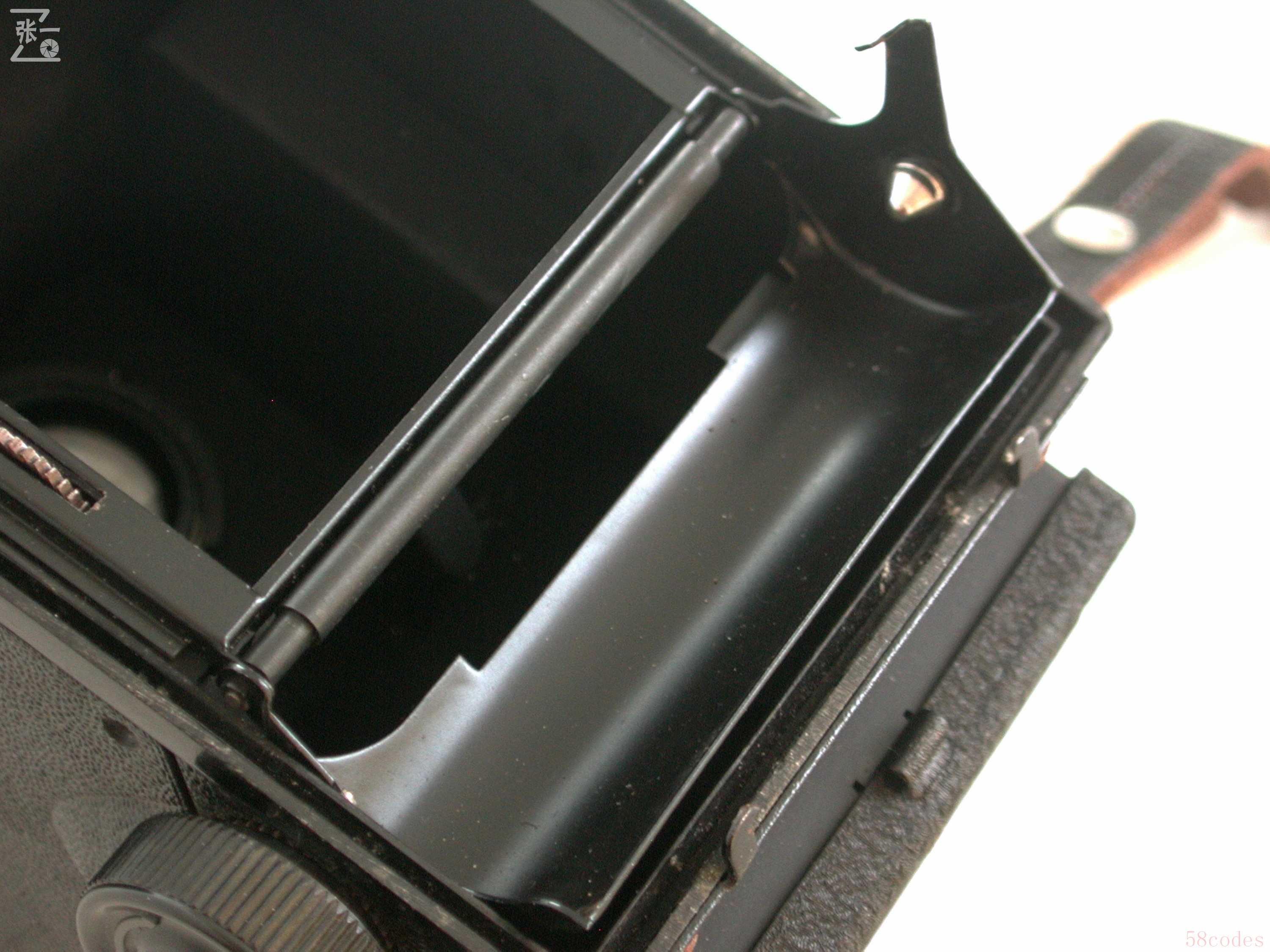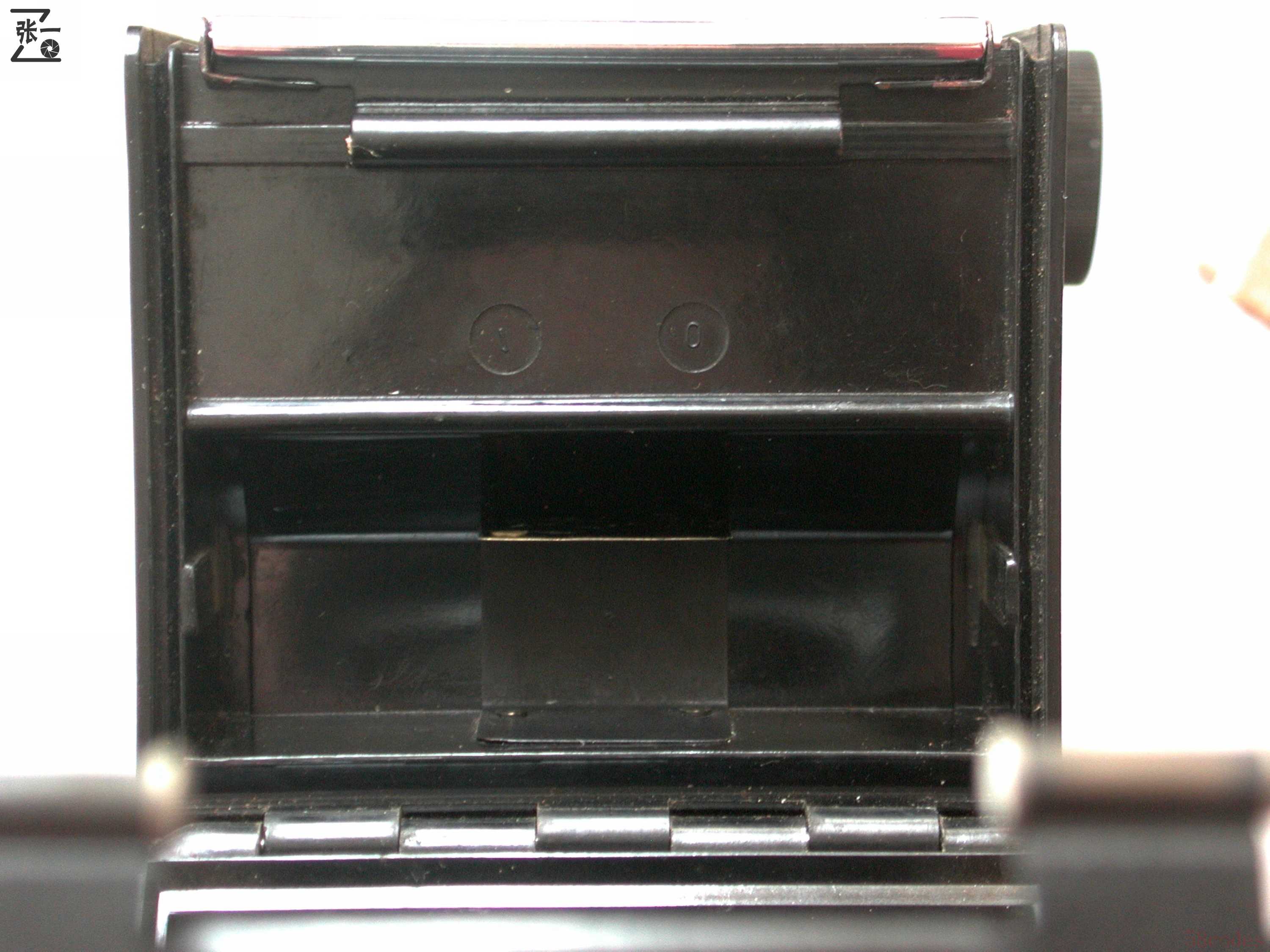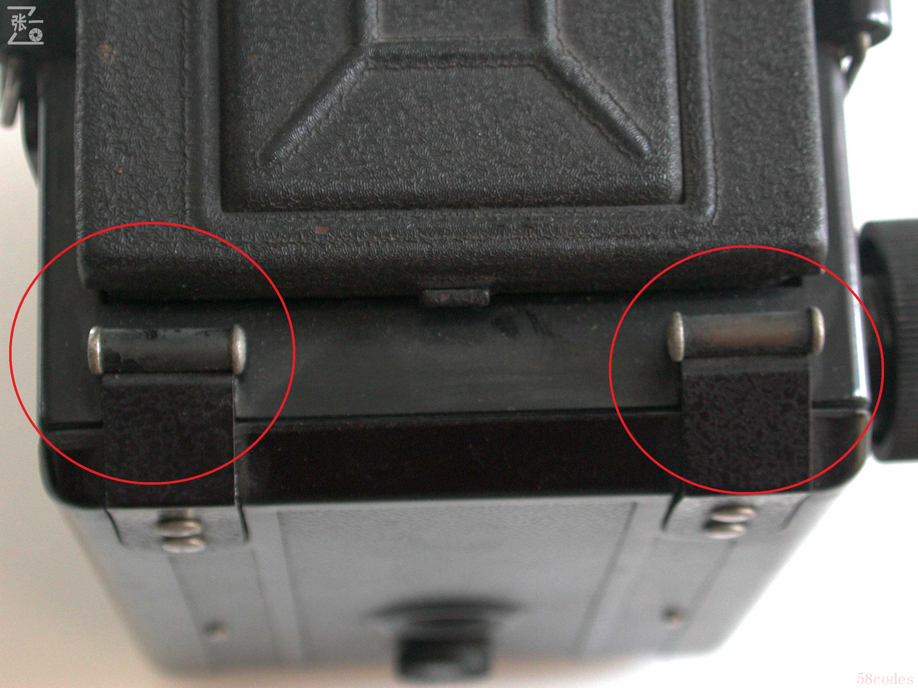 该机的机背打开方式和一般的国产双反相机(主要是海鸥双反)不大一样,是通过向上扳动机背顶部、靠近取景器位置的两个锁紧装置(下图中红圈内)来开启的的。
