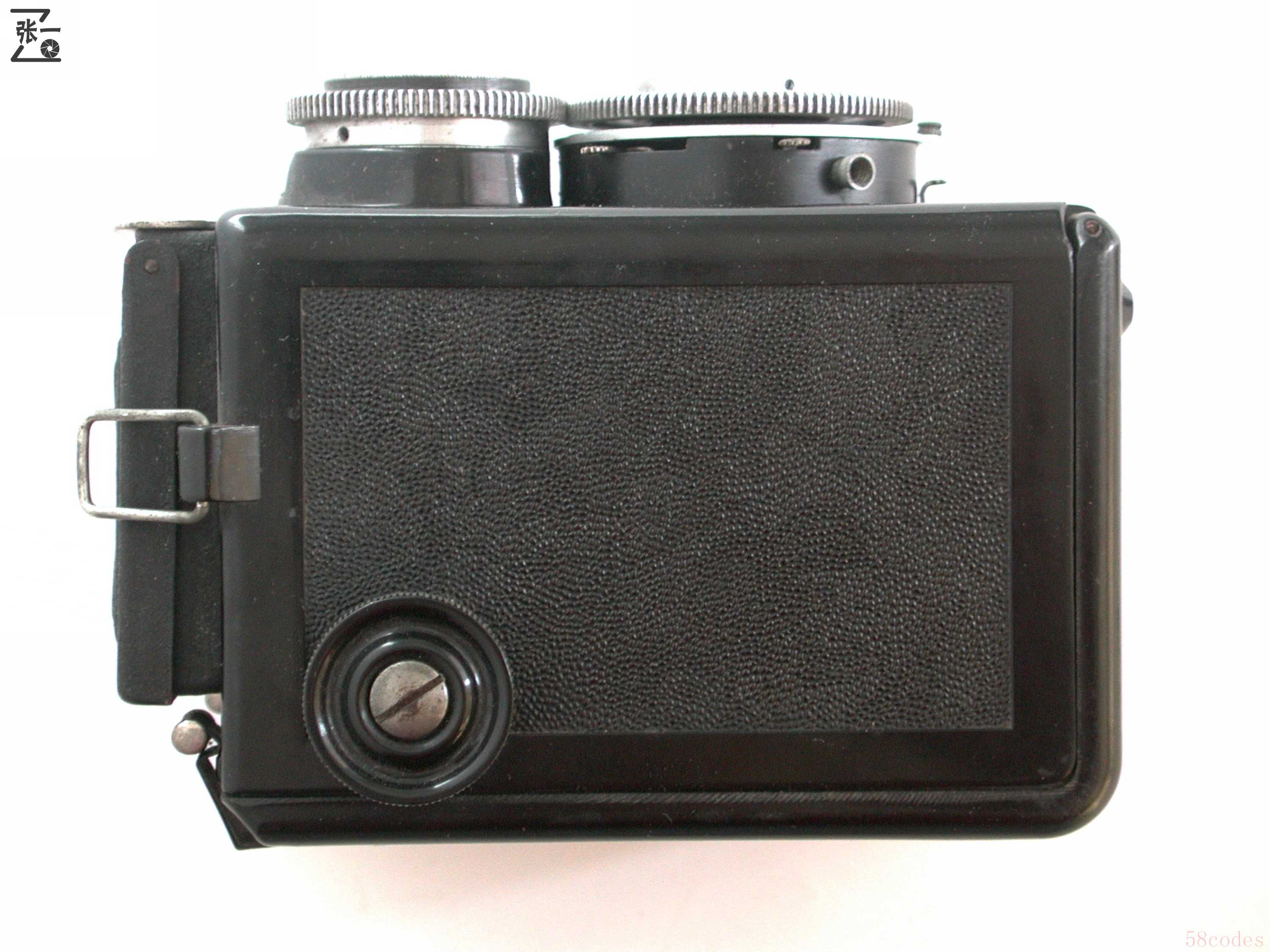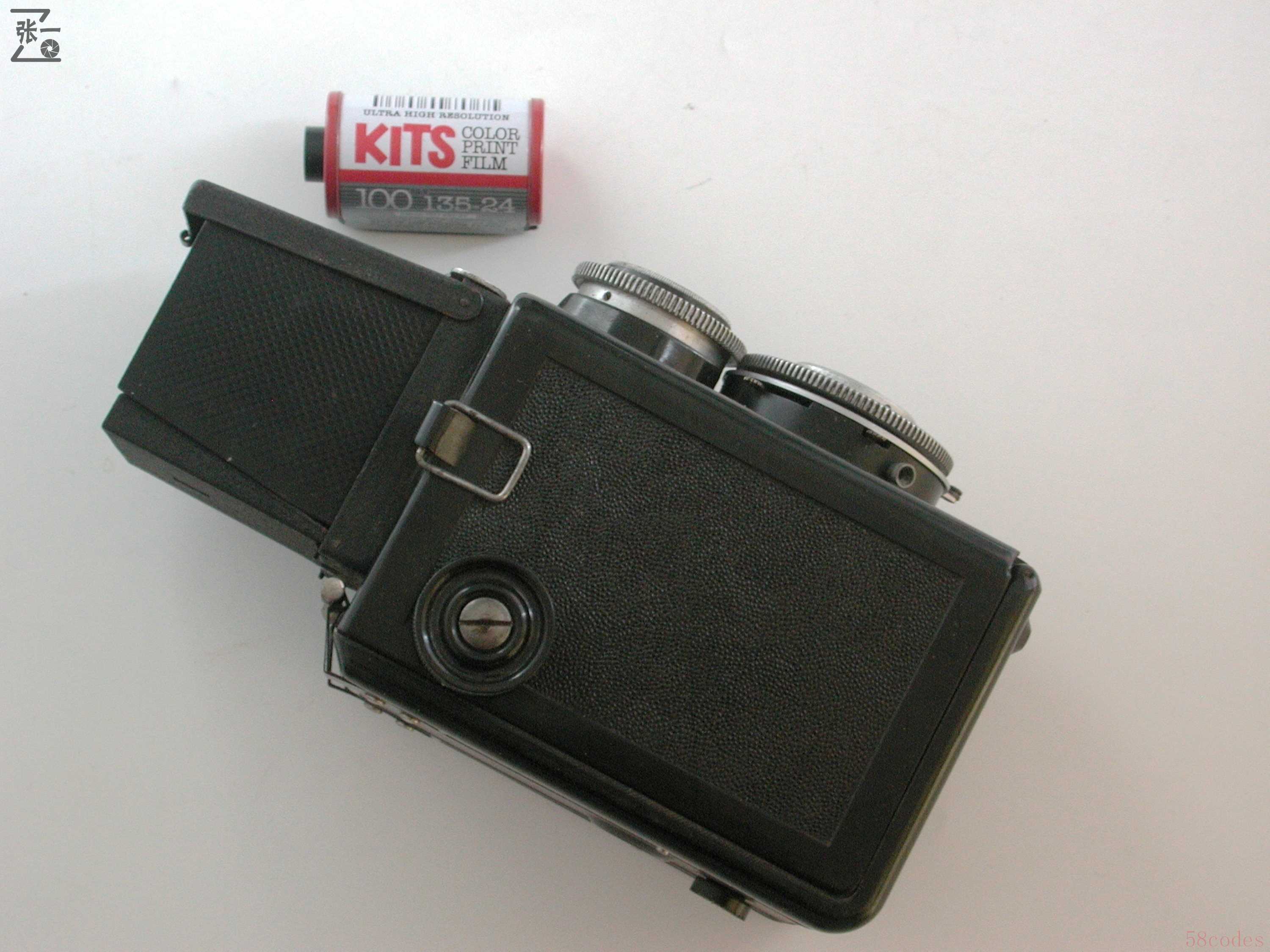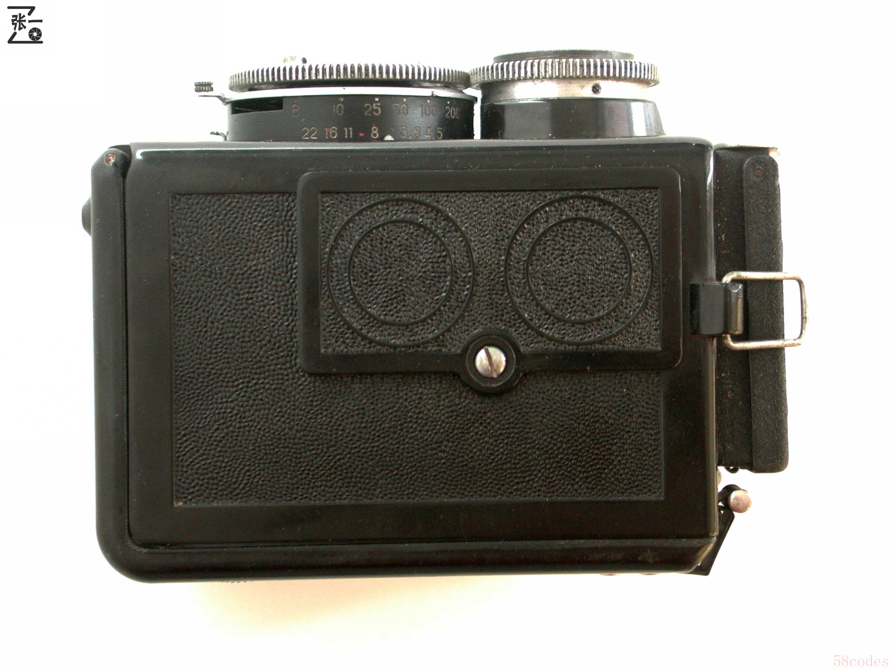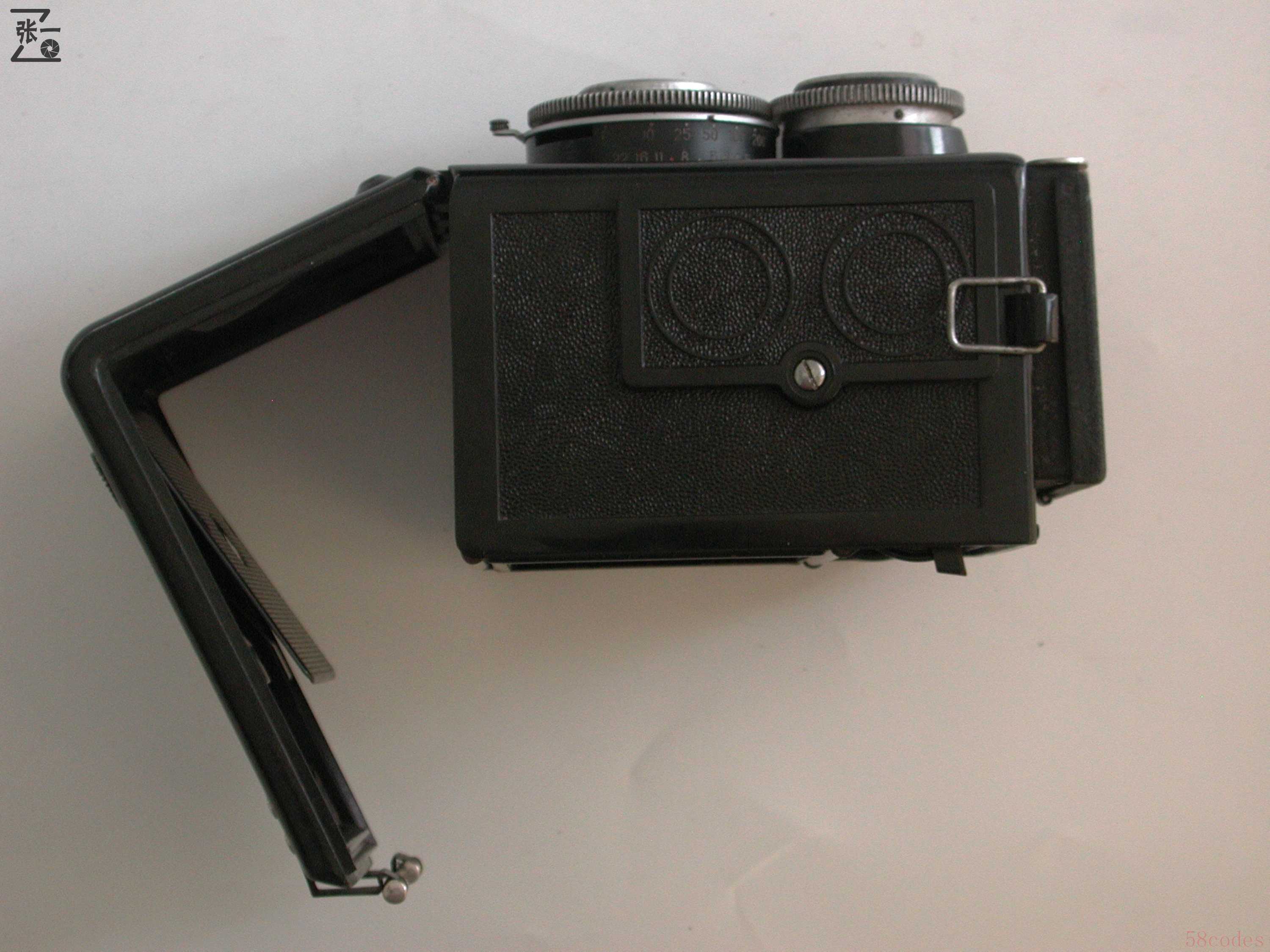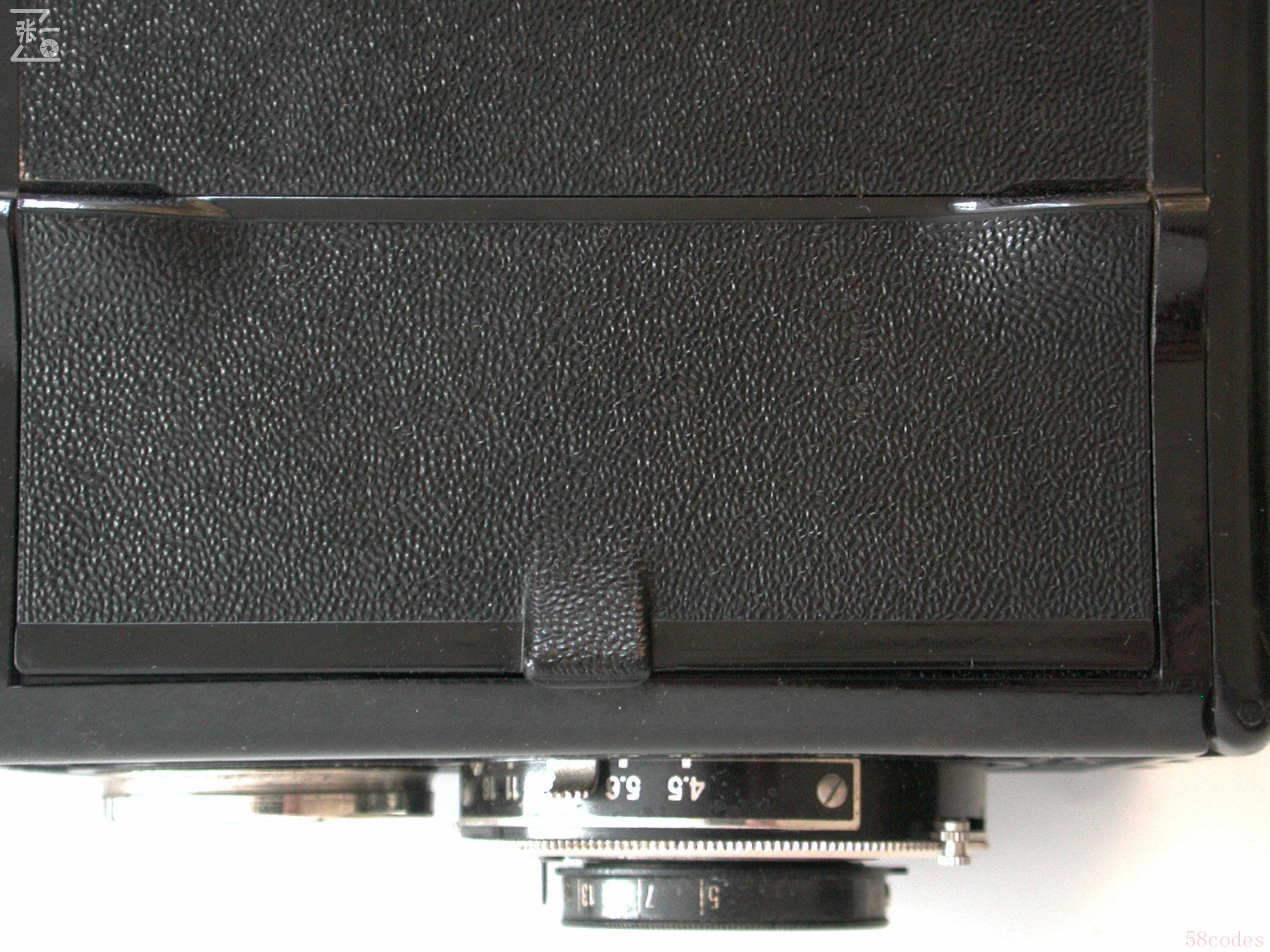 该机的机背打开方式和一般的国产双反相机(主要是海鸥双反)不大一样,是通过向上扳动机背顶部、靠近取景器位置的两个锁紧装置(下图中红圈内)来开启的的。