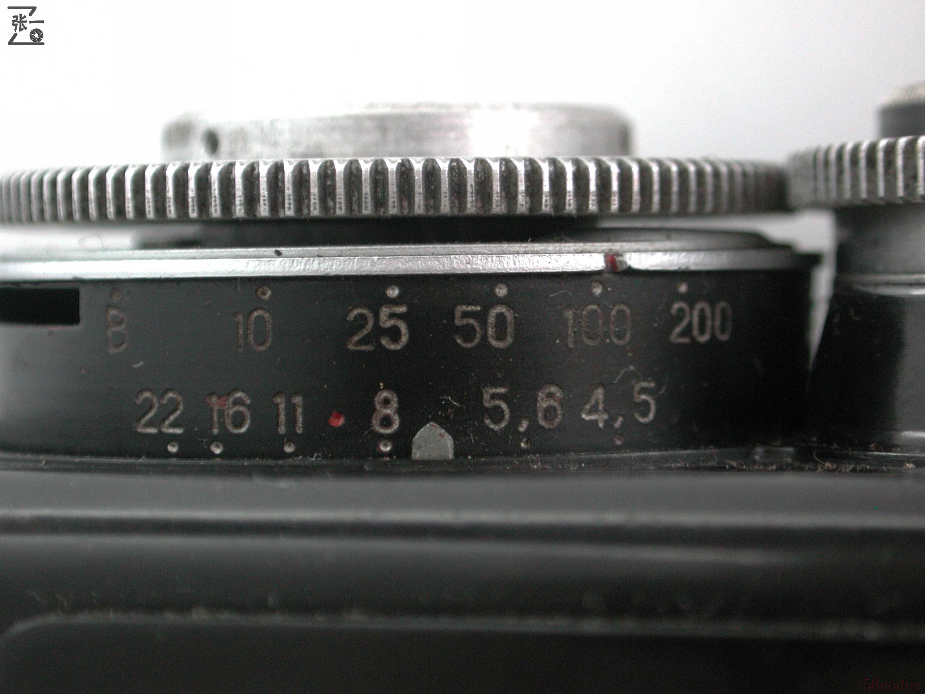 该机的快门速度和光圈档位在摄影镜头侧面都有标明,所以我就不再用文字赘述了。该机的过片和快门上弦并非联动,所以需要两个按钮分别来操作:下图2中12点钟位置的是快门上弦扳手,9点钟的则是快门按钮。