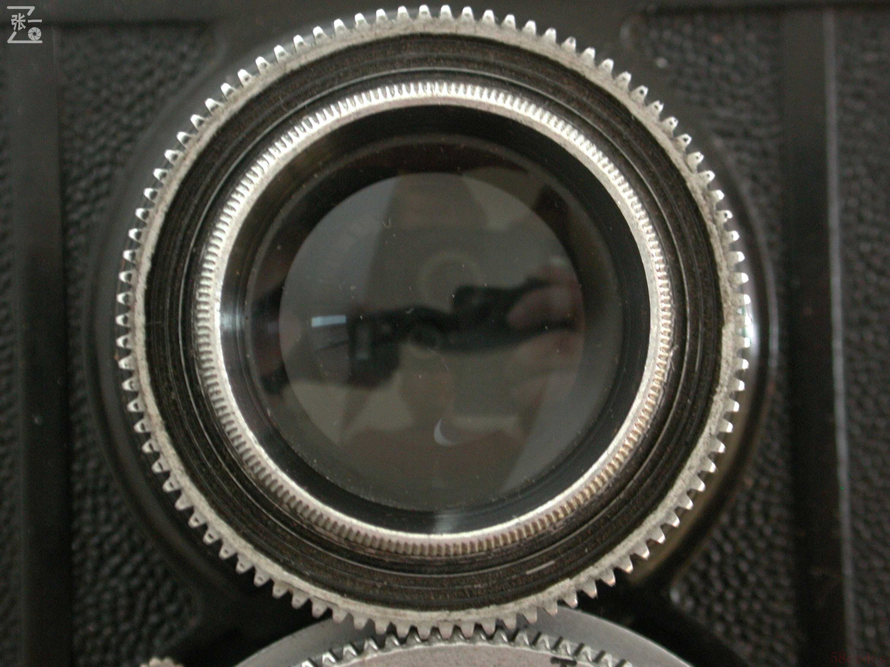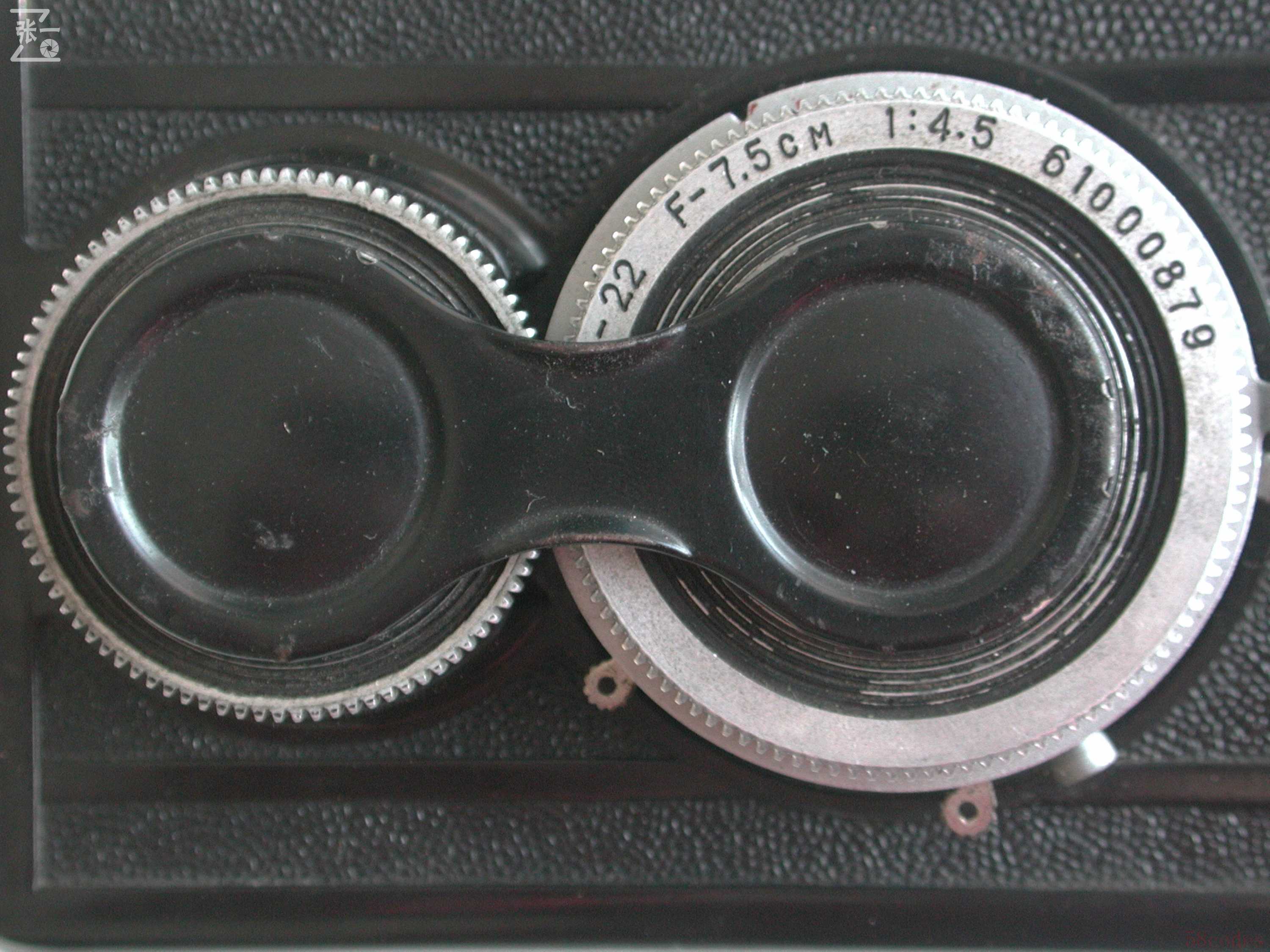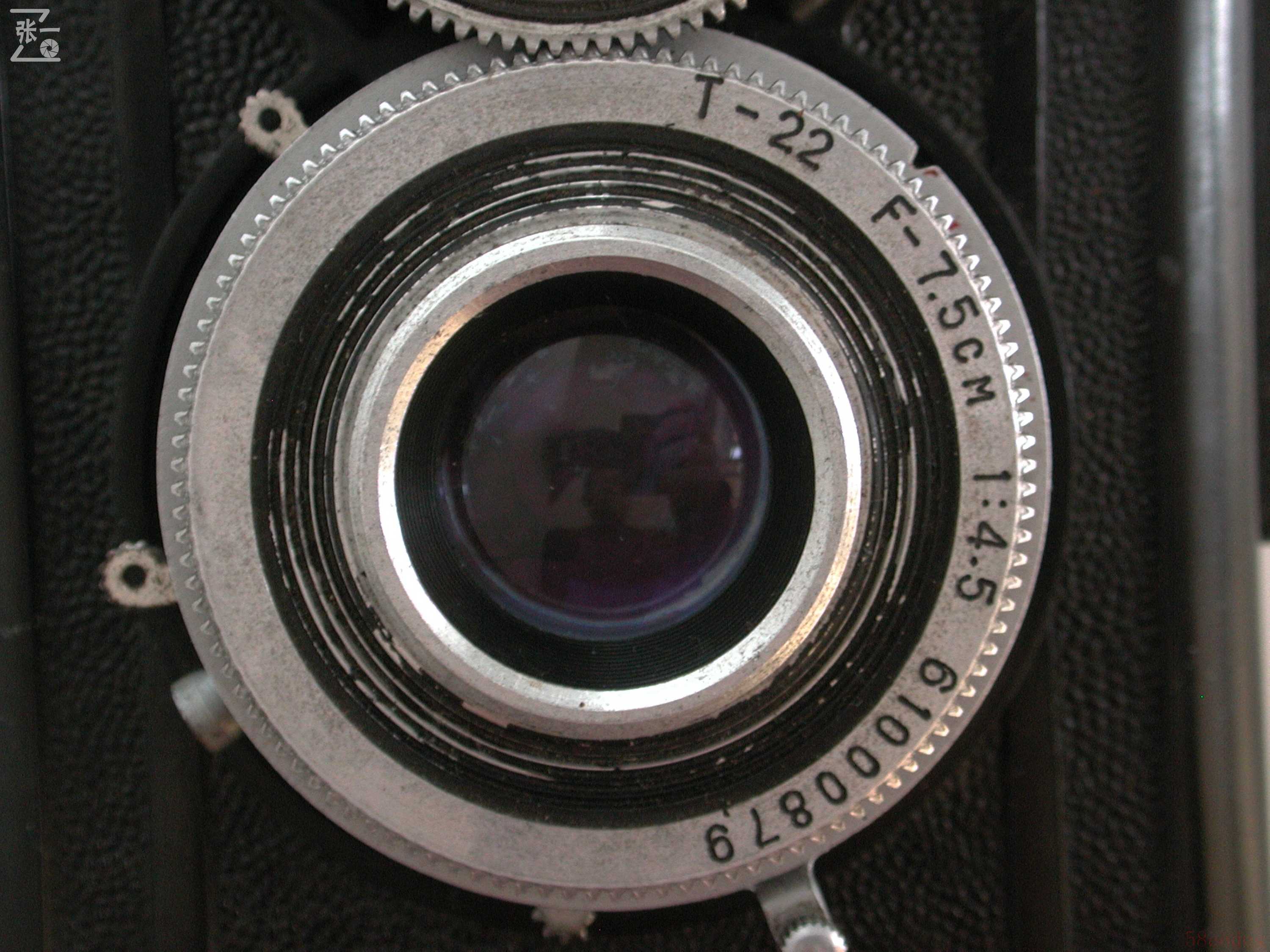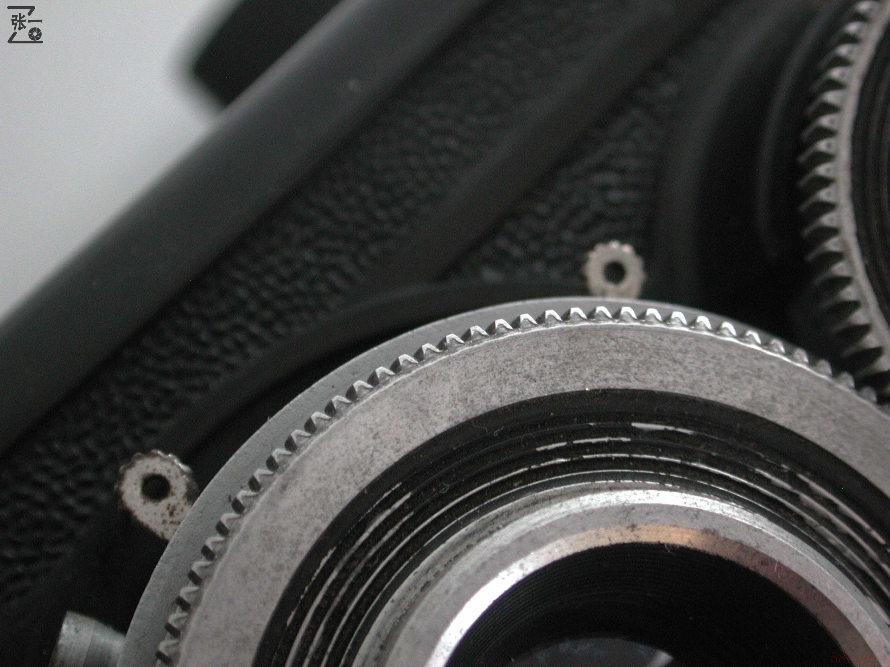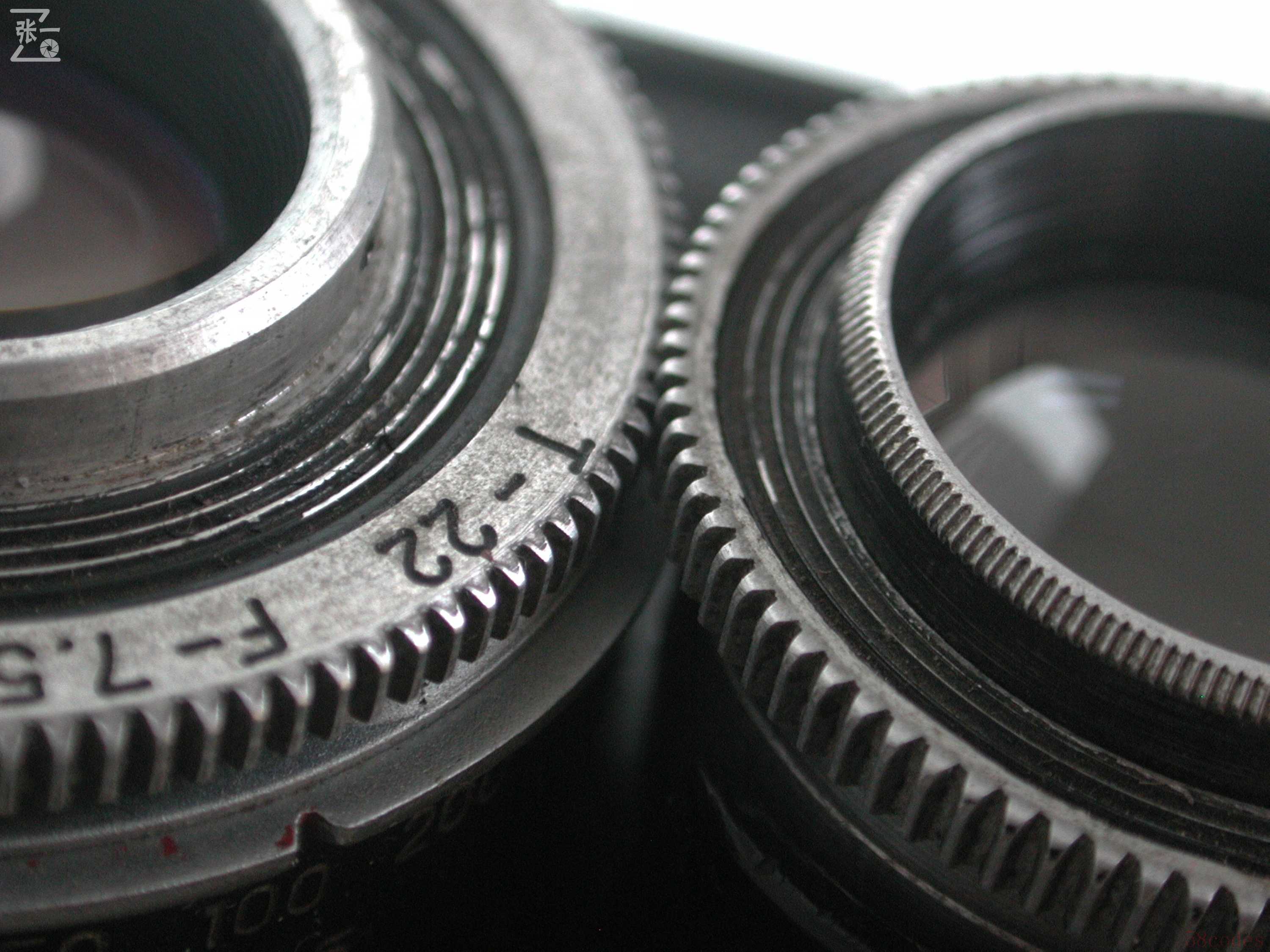 这款长乐双反相机的摄影镜头为一枚T-22 75/4.5镜头,镜头表面的颜色还是相当漂亮的。取景镜头没有标明任何参数,两个镜头通过齿轮的方式在调焦时进行联动。调焦标尺在取景镜头的上方,下图5。