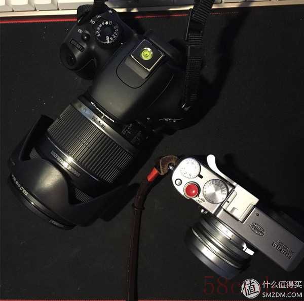△这个角度可以更加明显的看出两个相机大小方面的差别。(550D配了18-200的镜头和遮光罩,X100T加了遮光罩)