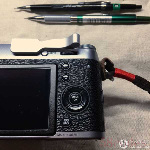 △可以看到机身模拟压花皮纹的质感,总的来说还是比较细腻的。手柄是后配的,图片上看起来不明显,但实际上和机身上部的银色还是稍微有点色差。但是有了这个手柄之后,相机握起来更加舒适。右上角的金属滚轮做了格子状的金属滚花,很细腻,手感也很棒,有点像pentel的自动铅呢~(三句不离老本行……)