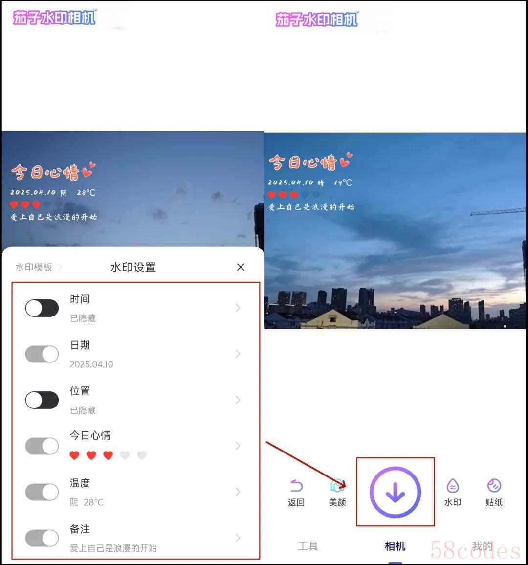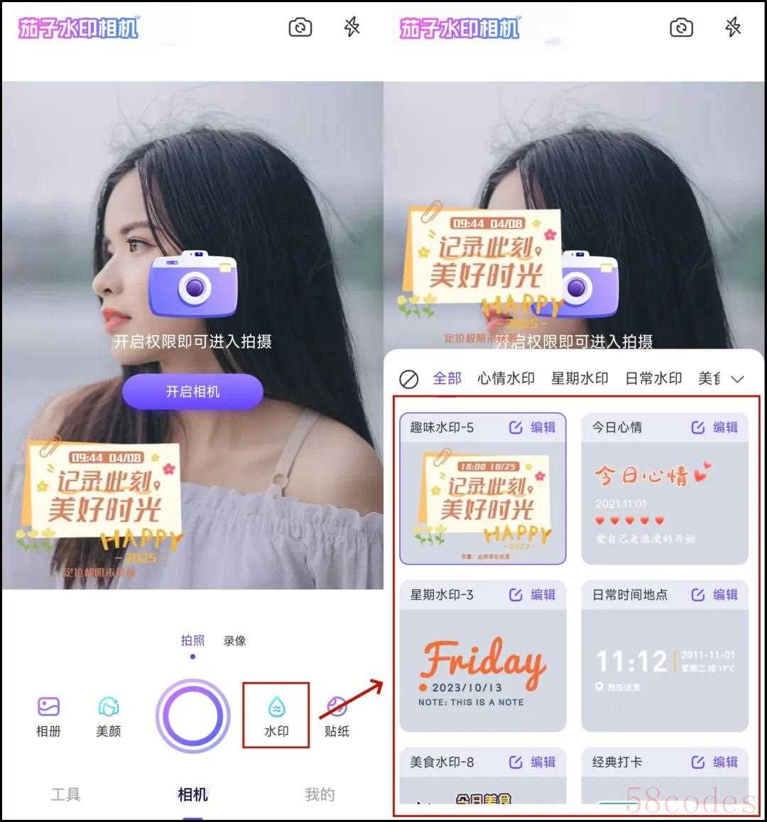 01 茄子水印相机茄子水印相机是一款功能丰富的水印相机应用,支持多种自定义设置,能满足用户在不同场景下的需求。首先打开APP,进入相机界面,点击“水印”按钮,滑动选择适合场景的模板;