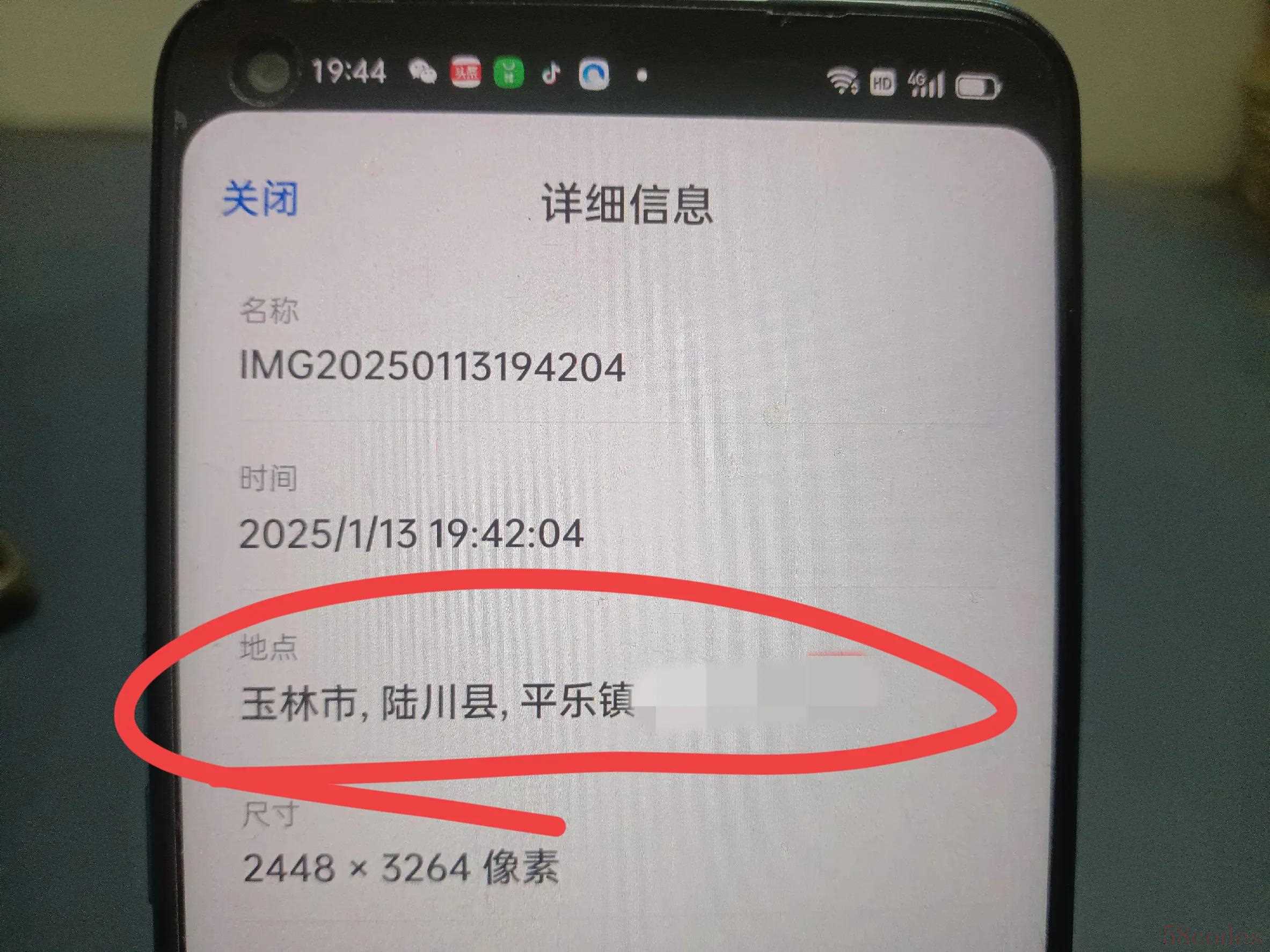 现在我给大家拍摄一张照片,看看效果。在照片的左上角能看到具体的拍摄地点。也就是位置水印,别人是无法去除的,只能用东西遮挡(如上图所示)