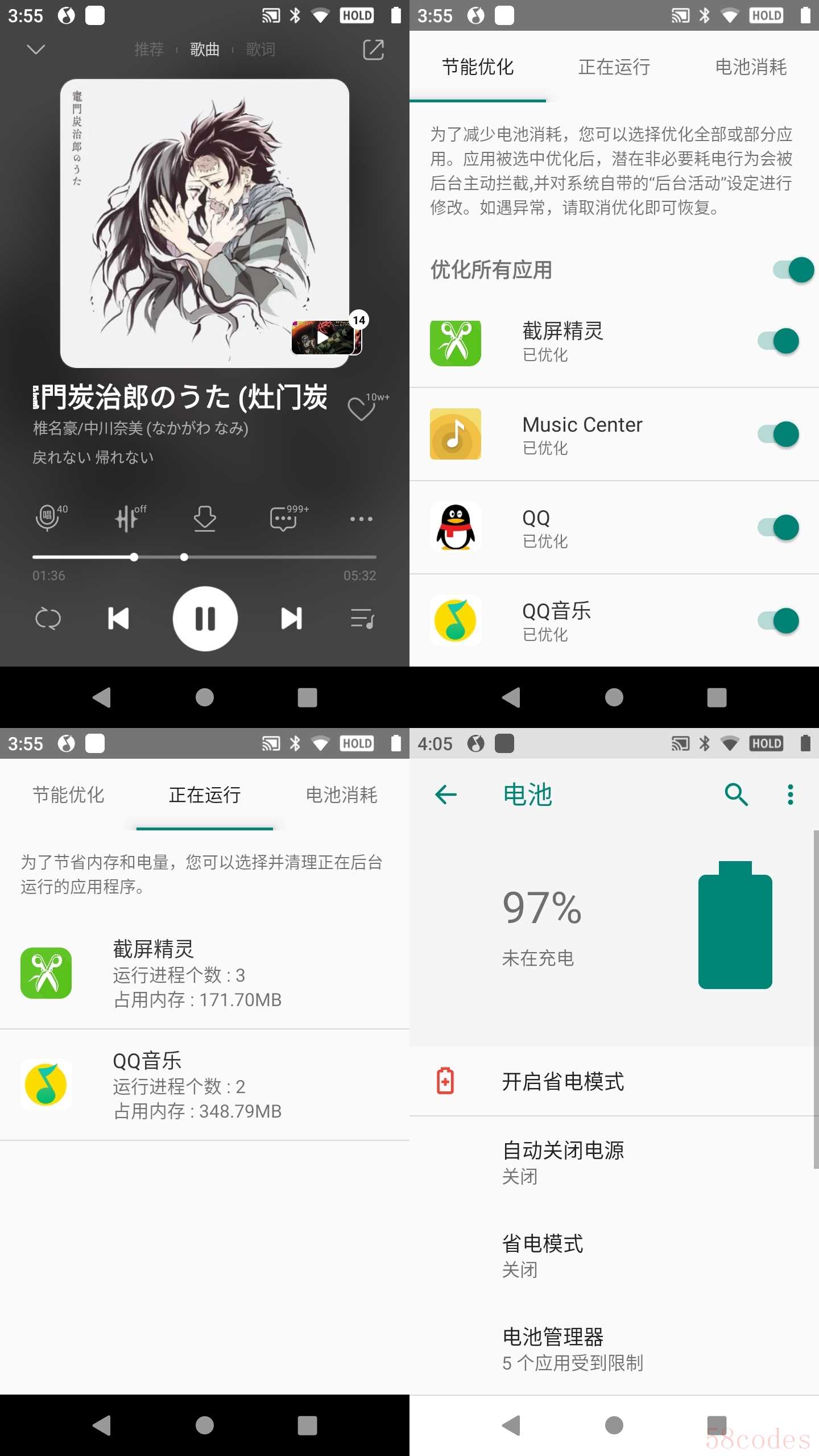 紧接着,我们开启节能优化,继续使用QQ音乐播放10分钟的歌曲,也就是从3点55分到4点05分,我们可以看到,设备最终剩余电量为97%,耗电1%。