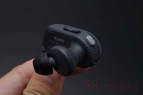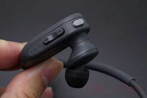 下图为耳机右侧操控区,除了前后切歌(按住时也兼顾快进后退)、播放暂停键、底侧按键为电源开关按键。耳机的绕耳部分为塑料硅胶包覆记忆金属设计,避免了佩戴时的角度舒适和抗形变的稳定性。操作区的按键表面都具有凹凸的触感表面设计,避免了很多人盲操作上的快速上手体验。