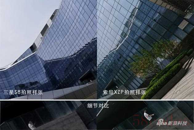 先是一组日间对比样张和,对比手机分别是三星S8和索尼Xperia XZ Premium。这组样张在手机观看下都有很好的画面宽容度和细节表现力,天空并没有出现过曝,暗部细节清晰;但对比来说,索尼白平衡更为准确,在大楼暗部的人物轮廓以及色彩保留更好,整体画面宽容度更高。
