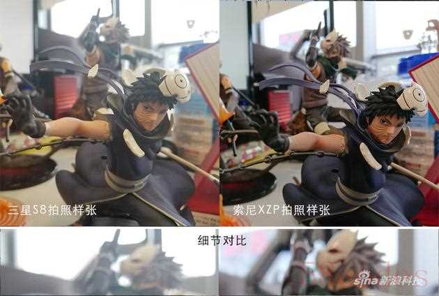 微距部分,三星S8有着更为优秀的白平衡准度和画面亮度保留,手办本身的肤质色彩更准确,焦段外虚化效果更为自然细腻。不过无论如何调整角度,三星都无法呈现窗外对面大厦的Logo,对高光的控制偏弱。