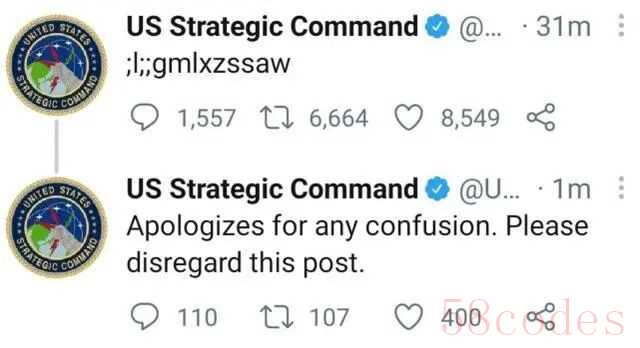 据美国福克斯新闻网3月30日报道,这条在推特上快速传开的推文原文为“;l;;gmlxzssaw,”,在删除之前获得了1.1万条回复。美国战略司令部随后又发布推文“为造成的任何混乱表示歉意”,并要求读者“无视”先前这条信息,但这条推文同样被删除了。