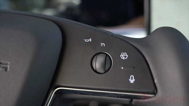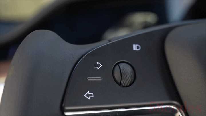 灯光的控制开关被直接做成了触摸键放在了方向盘上,操作灯光的方式也比较独特,你可以一直摁着对应的箭头来激活转向灯,松开便是取消打灯,或者长摁一下持续点亮,再次长摁便可取消,大灯控制也是同理。