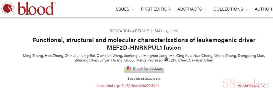 2022年5月,上海瑞金医院血液学研究所陈赛娟院士、陈竺院士、蒙国宇教授团队在国际血液学权威期刊Blood杂志上在线发表题名为“Functional, structural and molecular characterizations of leukemogenic driver MEF2D-HNRNPUL1 fusion”的研究论文。
