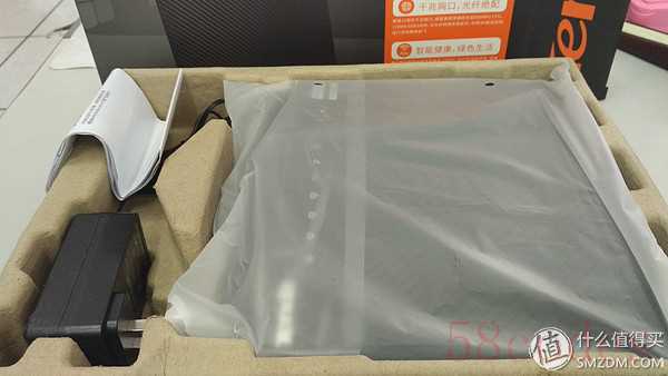 安装底座完毕之后,看看正面,上面黑色亮面下面磨砂带斜条纹,上面亮面已经有一层保护膜。。。缺点显而易见,撕下保护膜那个亮面很容易磨损。。。保护膜右侧有WIFI的SSID和密码。(密码里面childnear几个意思)