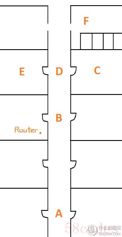 因为弄AC66U时候就是6月2日上午。。已经延时提交众测了。。。所以并没有图片。只是简单使用cloud walker测试几个点的信号强度。总得来说就是ABDE点跟AC9差不多。但是C点和F点逊于AC9,尤其是F点超过-80dBm达到不可用状态。如果刷Merlin改功率应该略强于AC9但是差距不大。