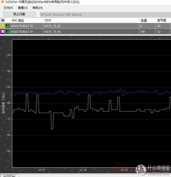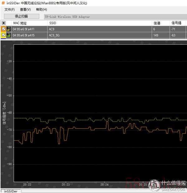 通过WirelessMon的测试,两款路由无线WiFi发射能力互有胜负,华硕2.4g信号较强,而腾达5g信号较强。