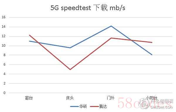 5G上传方面,华硕RT-AC1200GU接收能力优势明显,四个测试位置均领先。