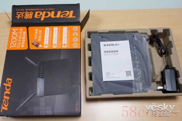 拆开包装盒,内部配置一目了然,产品、底座、网线、说明书、电源,井然有序的安置在内盒之中。