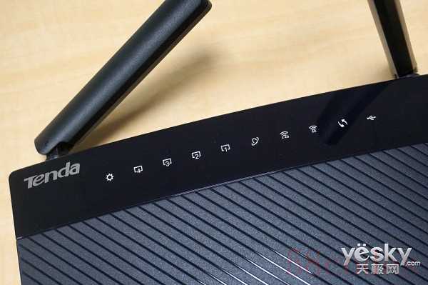正面经过镜面处理的部分,汇聚有腾达品牌LOGO及一排的指示灯,路由器在正常工作时对应的功能图标会有相应的指示灯亮起,方便用户有效的识别产品工作状况。从左至右分别是系统状态、内网4-1接口、外网接口、2.4Ghz频段指示、5Ghz频段指示、WPS按键、USB接口状态指示。