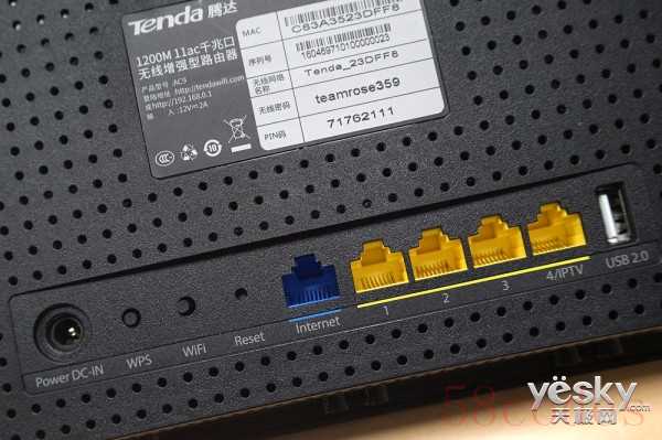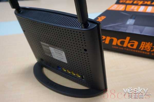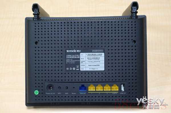背部接口,从左至右分别是电源、WPS按键、WiFi开关、外网接口、内网1-4接口、USB2.0接口。网络速率的飞速发展,我们不难看到千兆网络的来临已经迫在眉睫,而腾达AC9的千兆网口设计更为后续的延展留下了足够的空间。