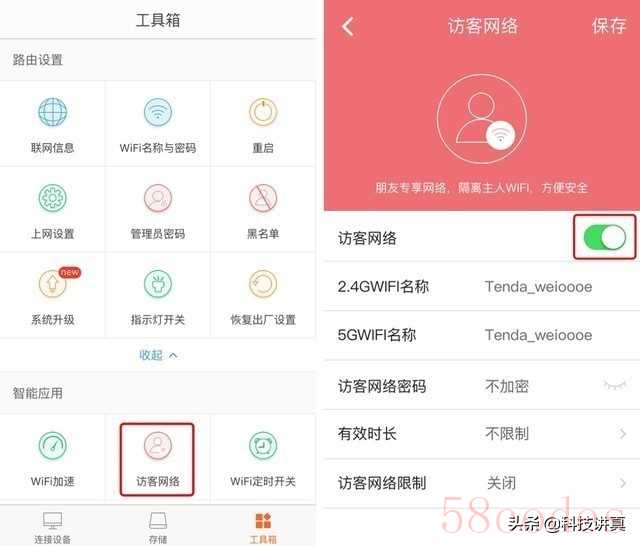 具体操作:打开"TendaWiFi"APP,点击"工具箱"-"访客网络"-可根据喜好设置WiFi名称、密码和允许连接网络的时长,当然你也可以不设置访客网络的密码,方便客人使用。