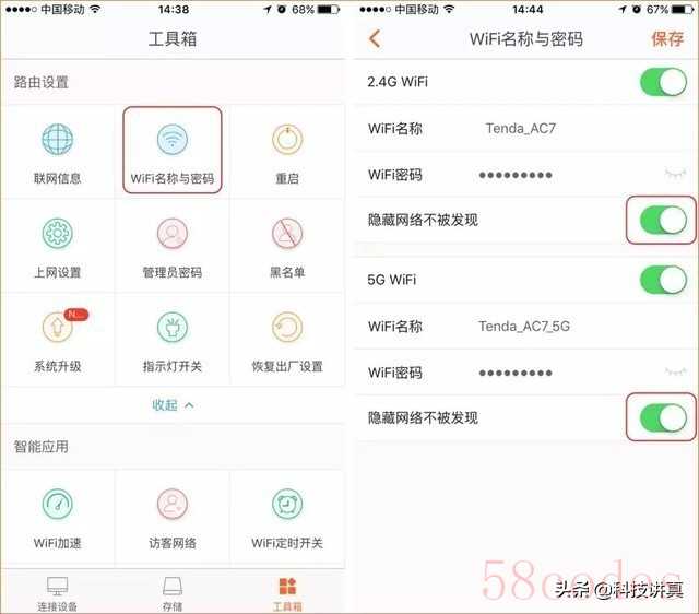 方法:打开"TendaWiFi"路由管理APP,在【工具箱】中找到【WiFi名称与密码】,然后开启【隐藏网络不被发现】即可将WiFi名称隐藏。