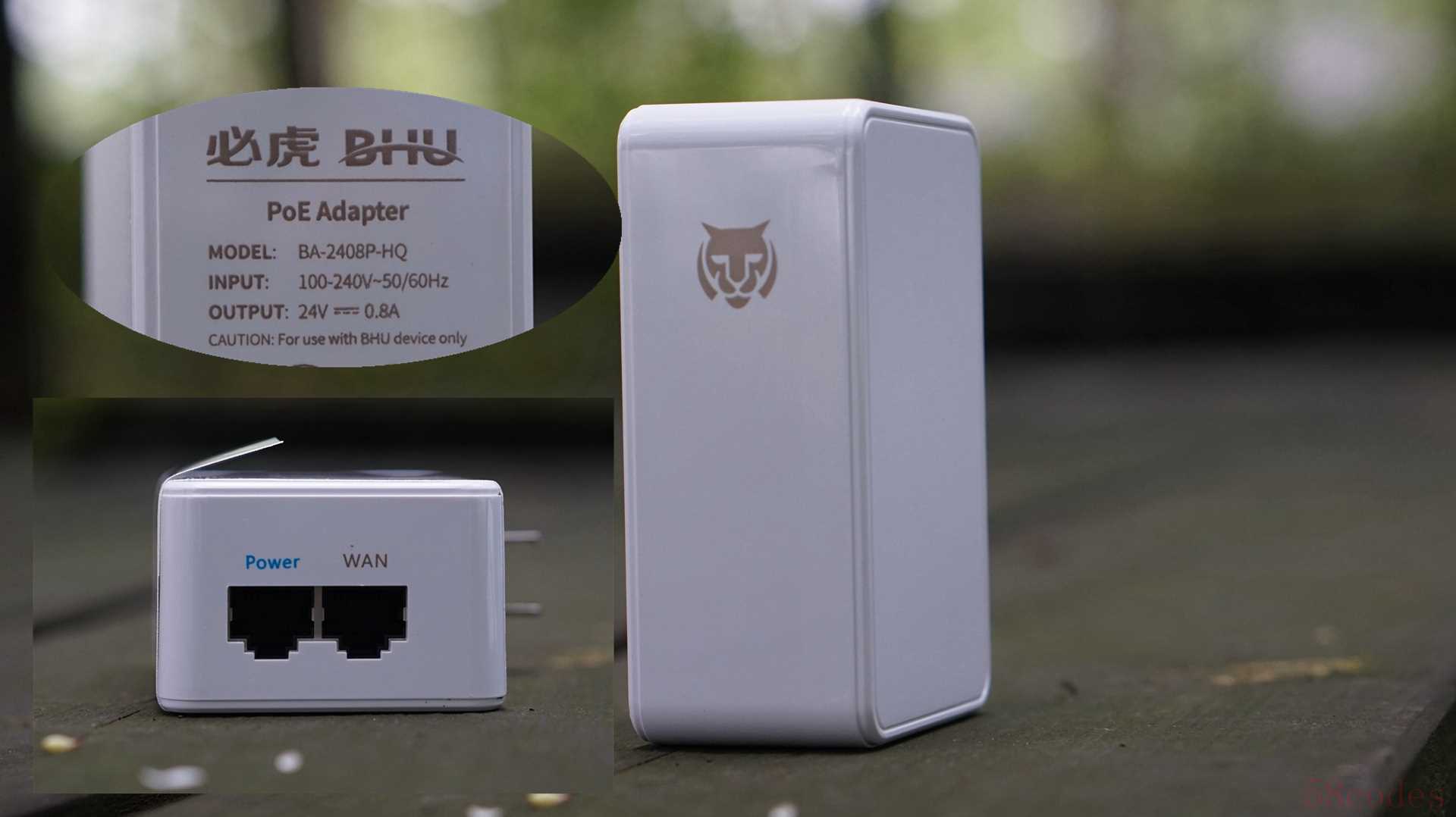 有新意的24V 0.8A“POE电源适配器”,有一个LAN口和power口,Power插入网线可以给必虎Plus供电,路由器中罕见的设计,优点是在有。