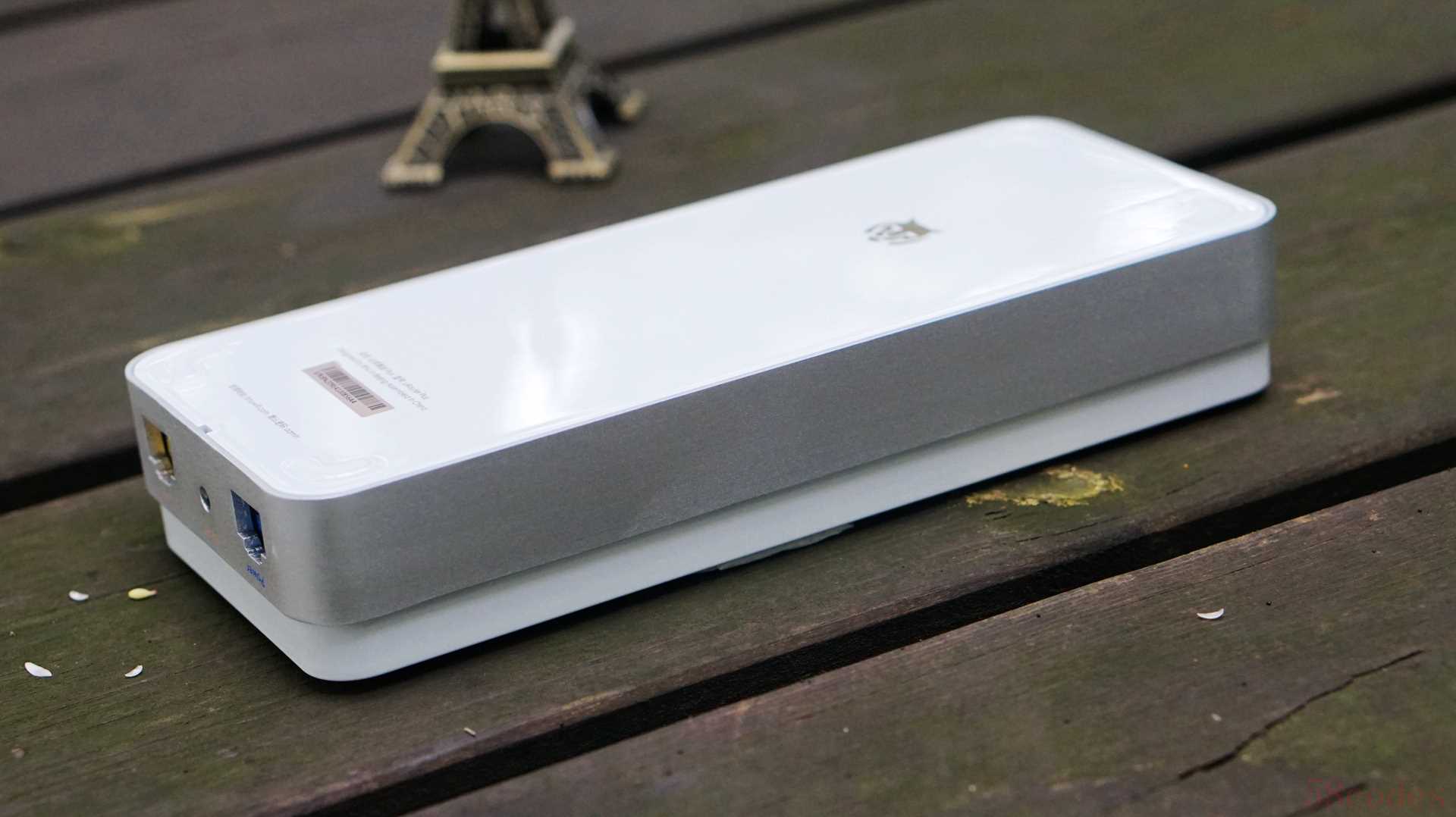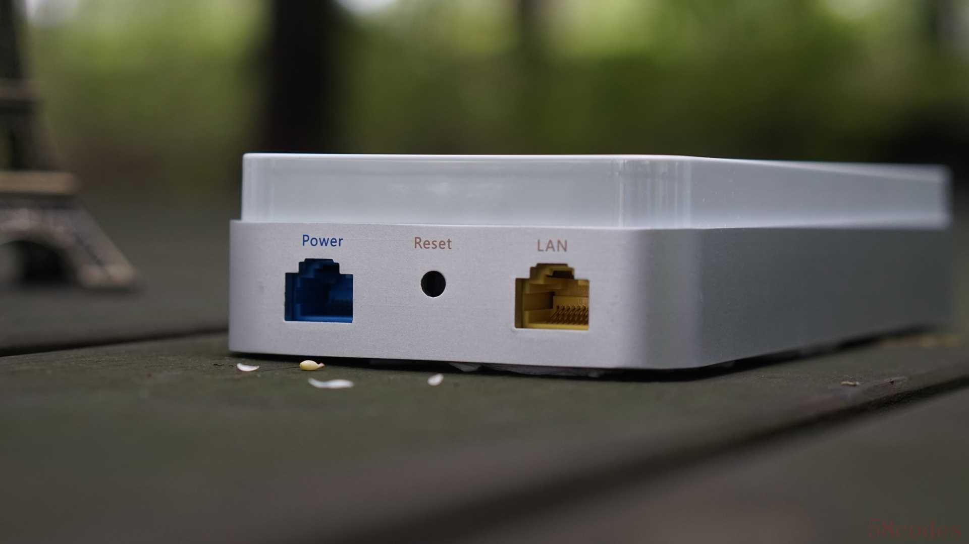 必虎Plus主体采用两段式设计,上方钢化玻璃,下方铝镁合金金属外壳,整体全封闭机身一体成型,路由质感不错,同样端口有一个LAN和网电一体的Power电源接口。