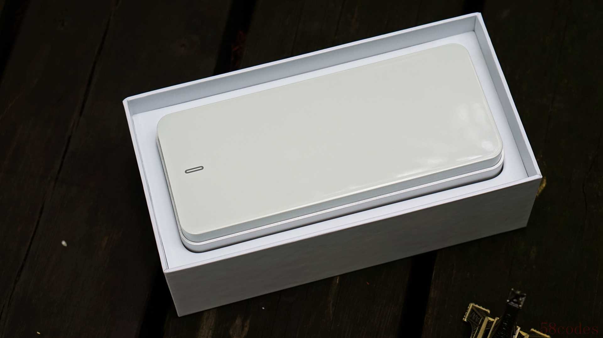 打开包装的过程,阻尼感细腻(非常苹果),下方就是必虎Plus的主体,长方体造型很独特,笑称“板砖”,不见外置天线,顶部也是亮面。