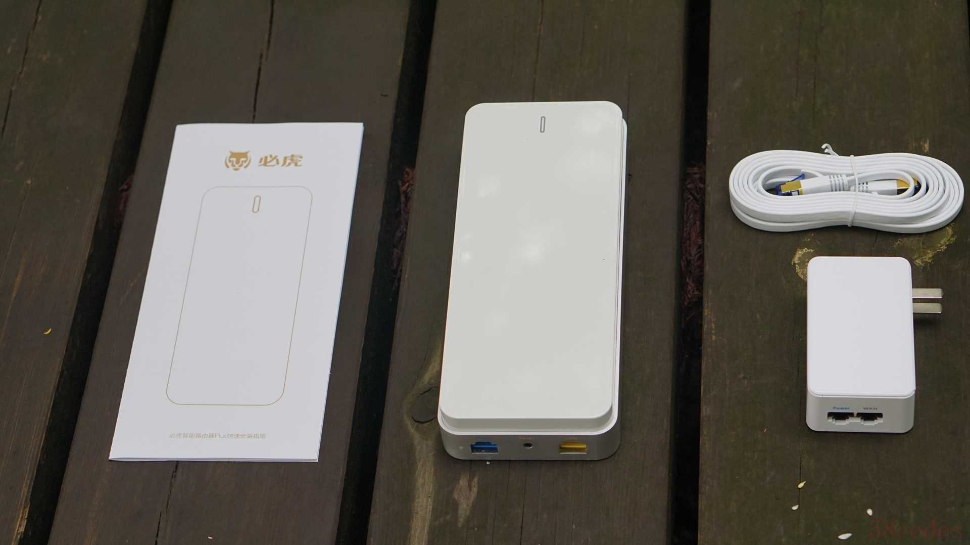 全家福(从左到右):说明书,必虎路由器Plus主机,右侧是独特的POE充电头和数据线(这也是一大亮点)。